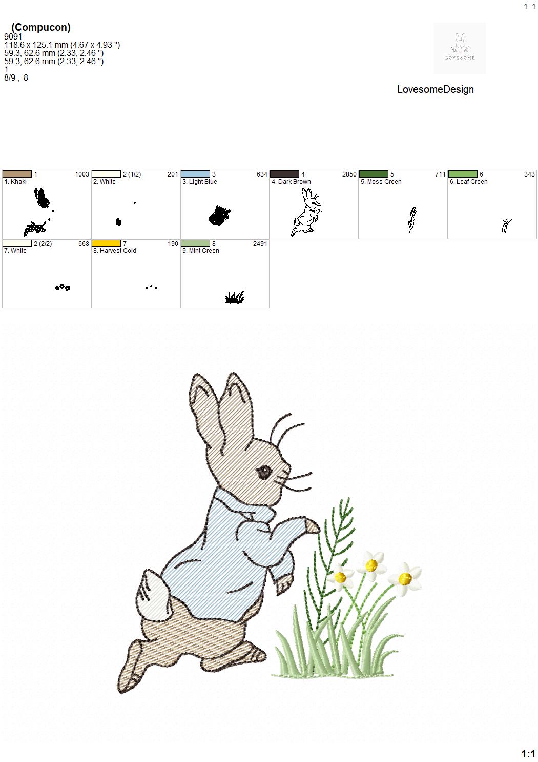 This listing features a machine embroidery file of quick stitch Peter Rabbit with meadow florals design in 5 inch size.