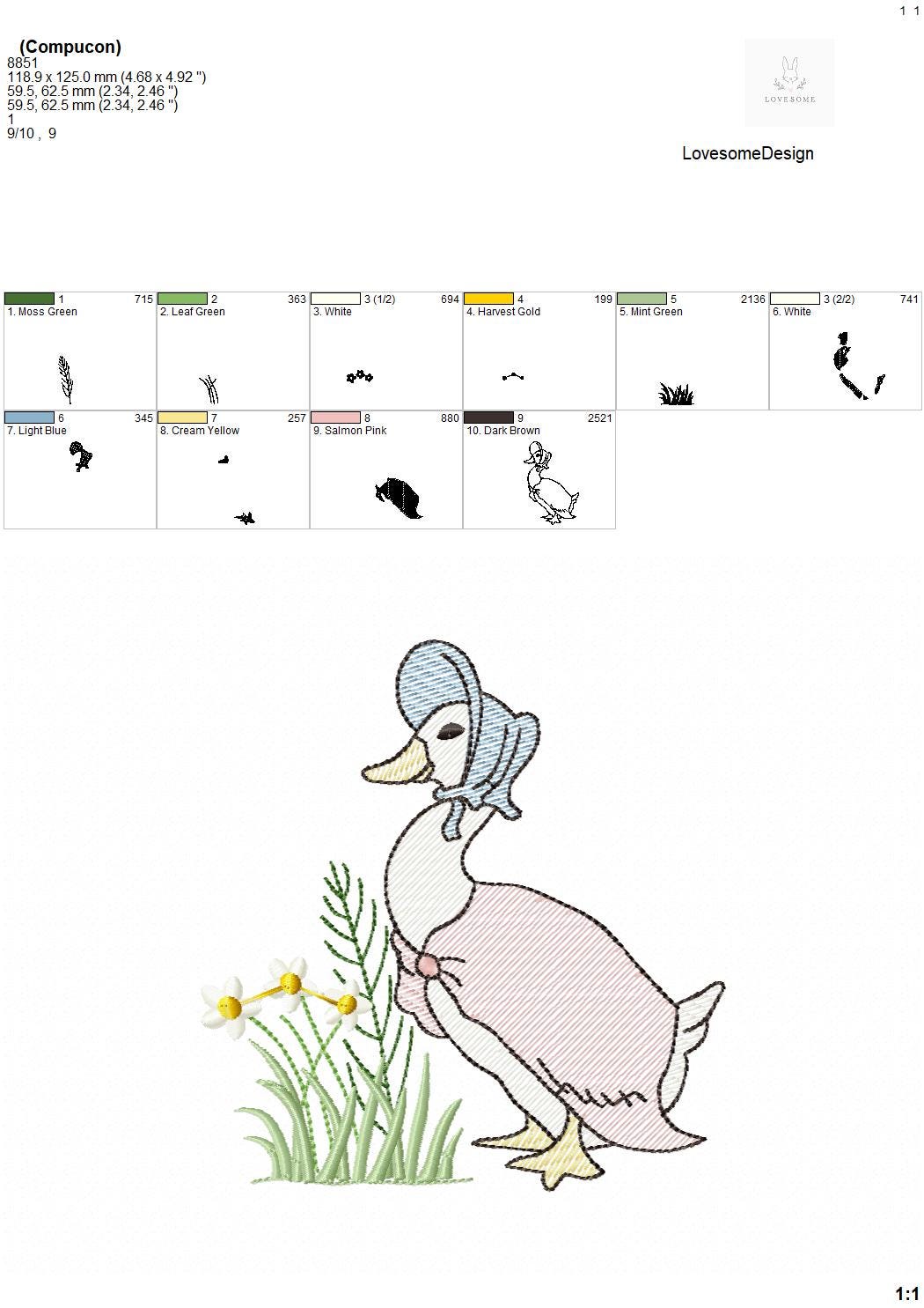 This listing features a machine embroidery file of quick stitch Jemima Puddleduck with meadow florals design in 5 inch size.