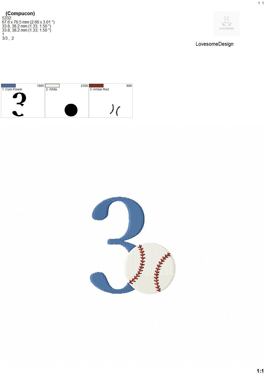 This listing features a machine embroidery numbers set which includes embroidery files of 10 numbers 0-9 with a baseball design in 3inch size. (For the whole set, pls see the listing images.)