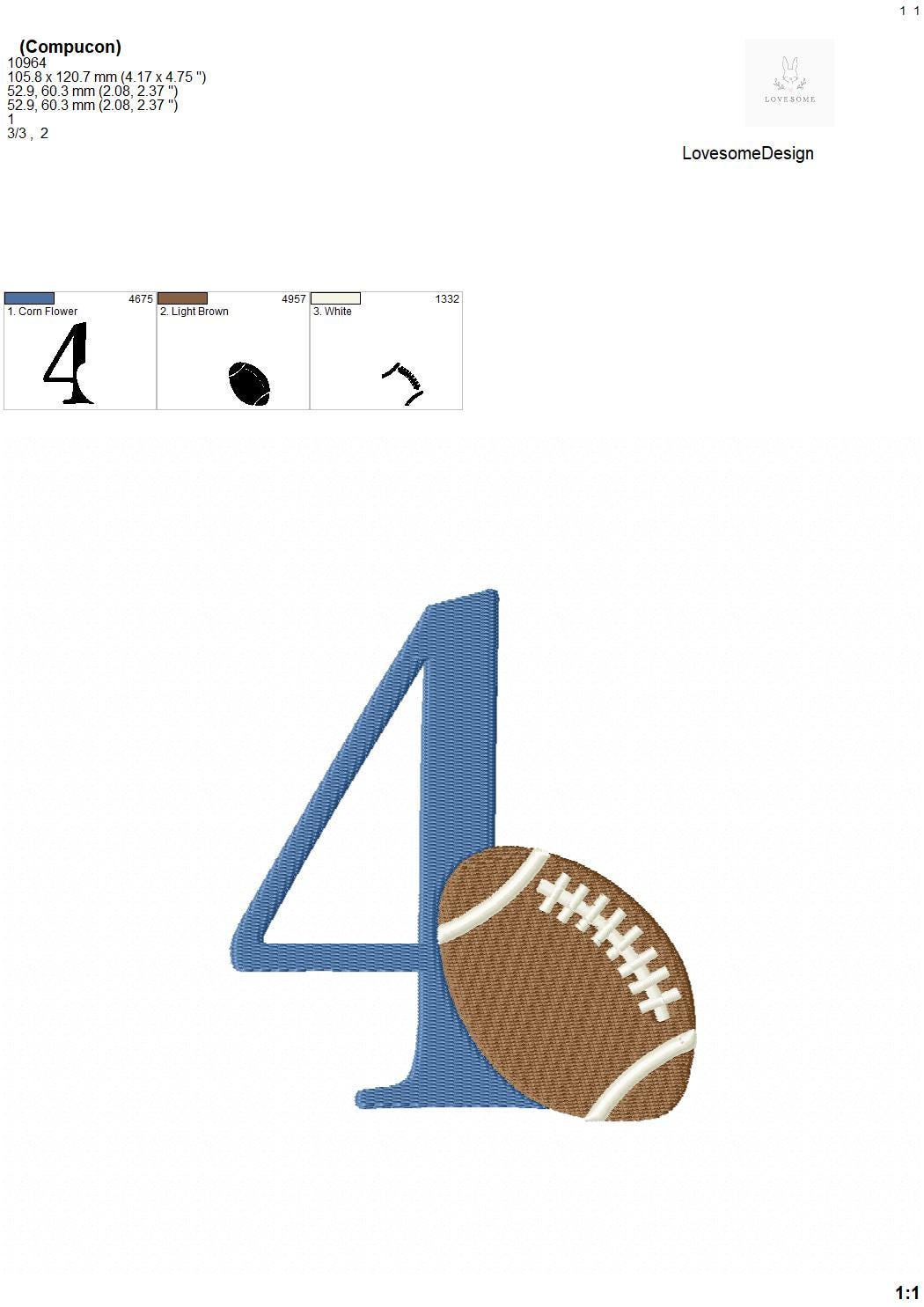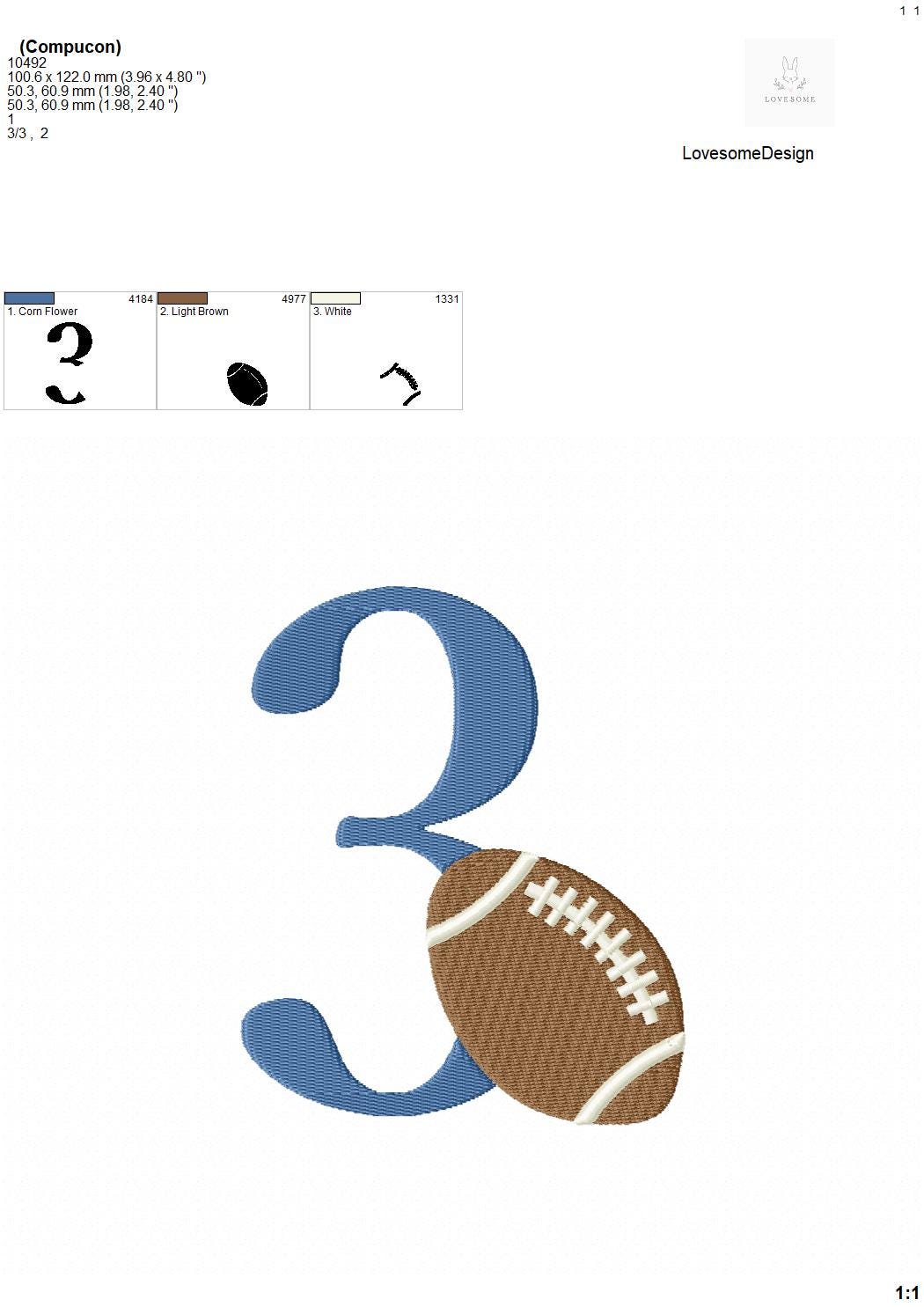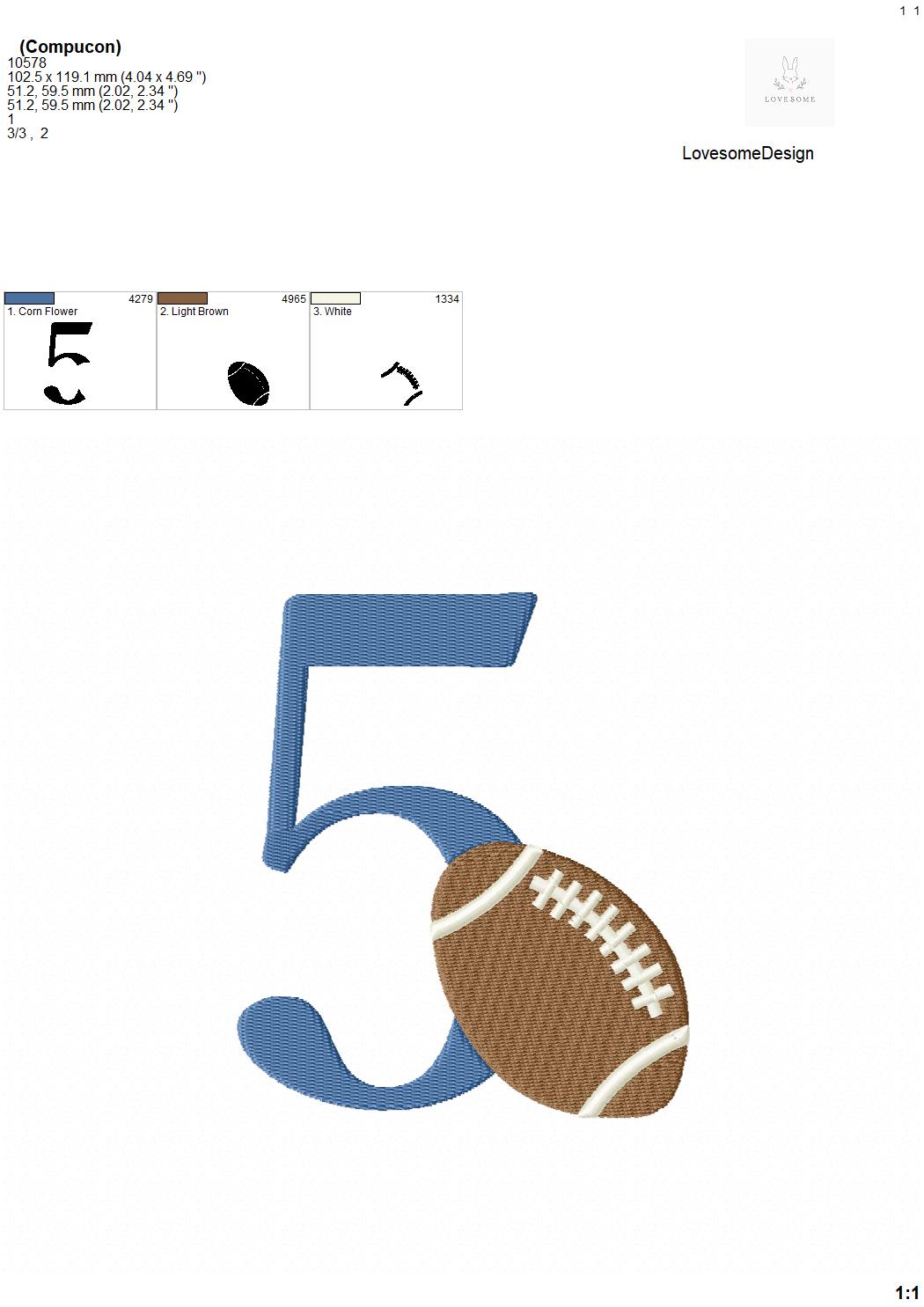 This listing features a machine embroidery numbers set which includes embroidery files of 10 numbers 0-9 with an american football design in 5inch size. (For the whole set, pls see the listing images.)