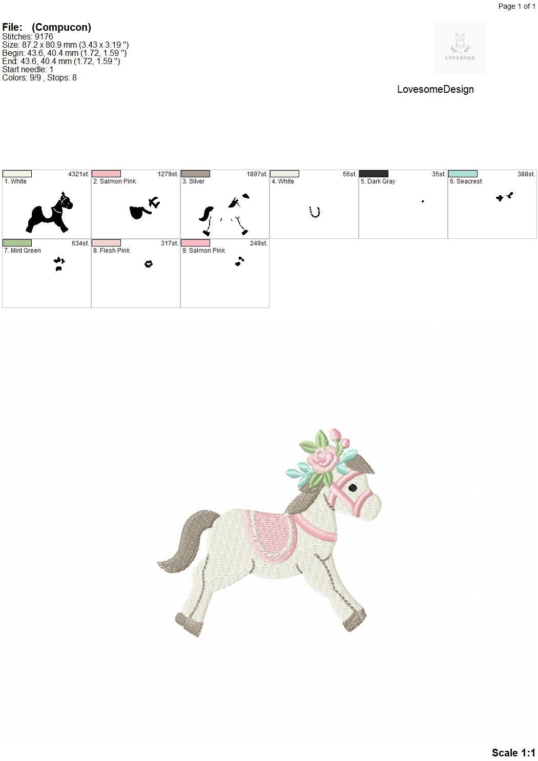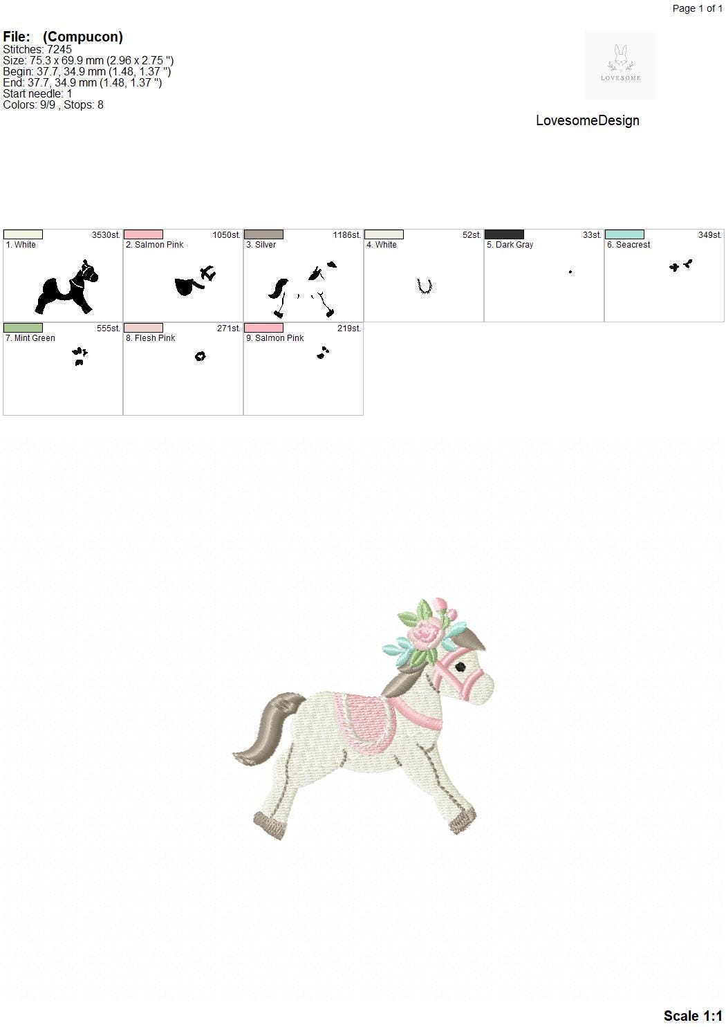 This listing includes one cute floral horse design for machine embroidery in two small sizes, appr. in 3.5inch and 3inch sizes.