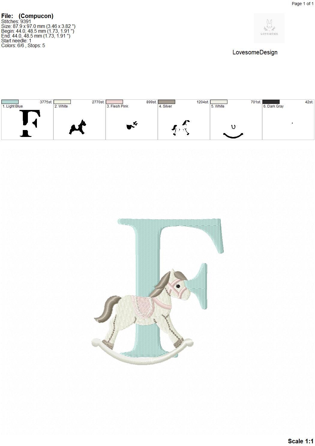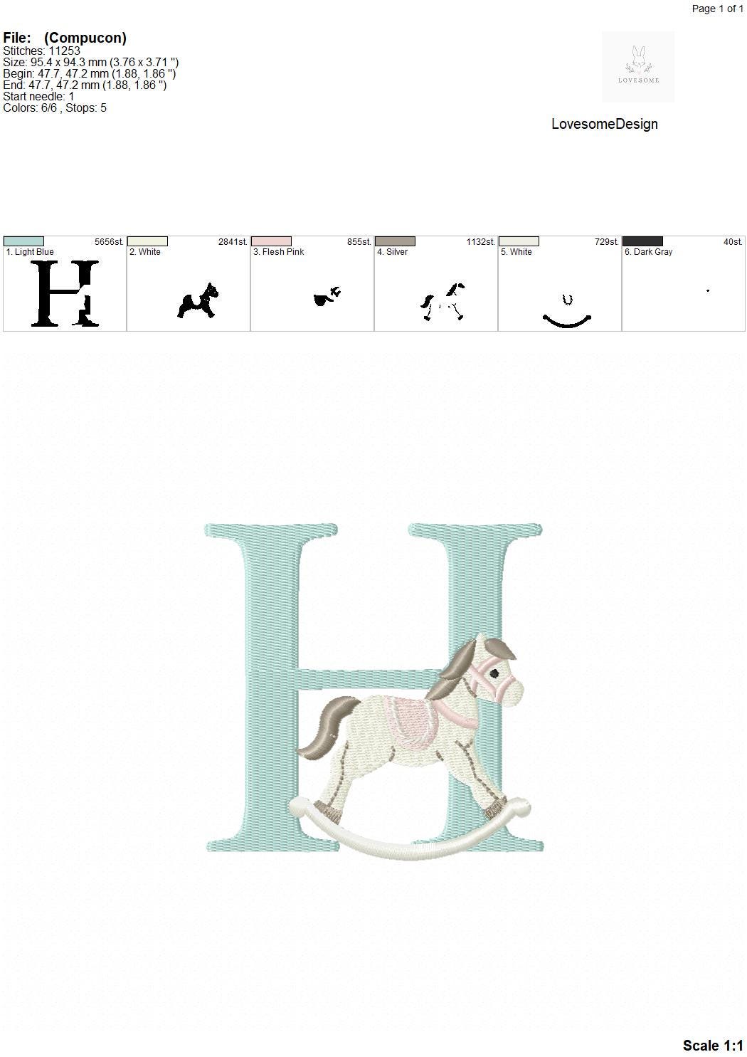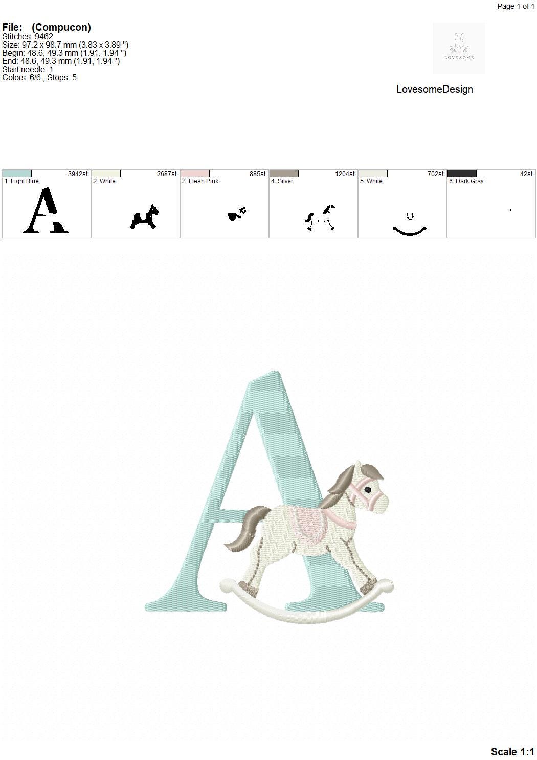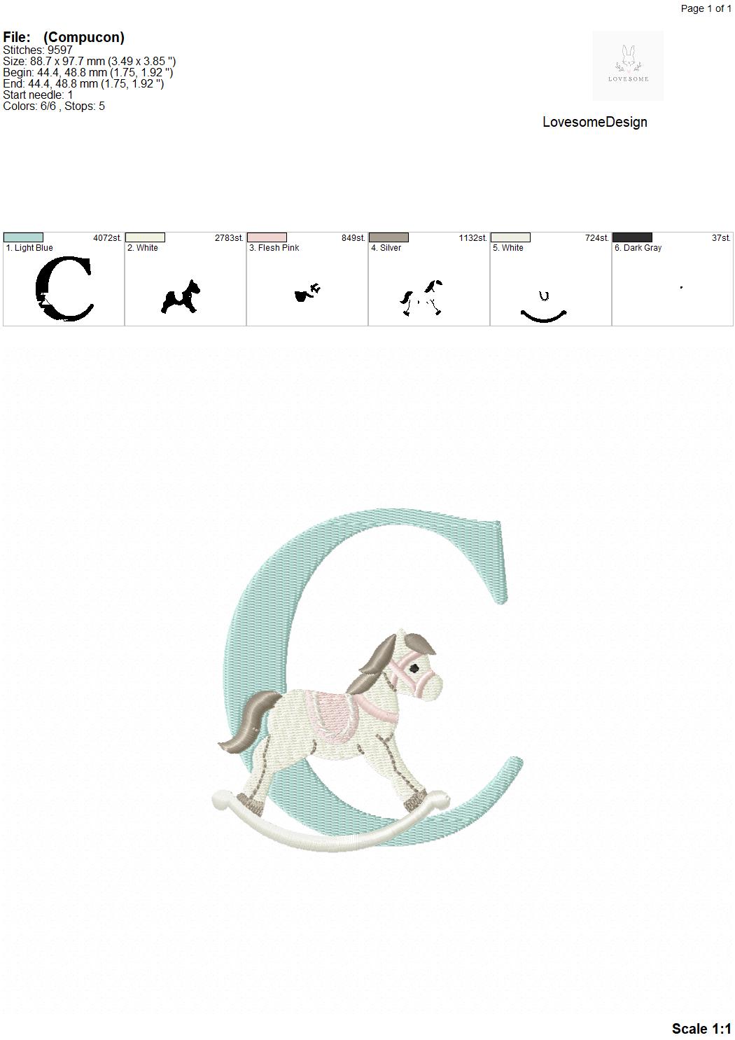 This listing features a machine embroidery font set which includes embroidery files of 26 uppercase monogram letters with cute rocking horse design in 4inch size. (For the whole set, pls see the listing images.)