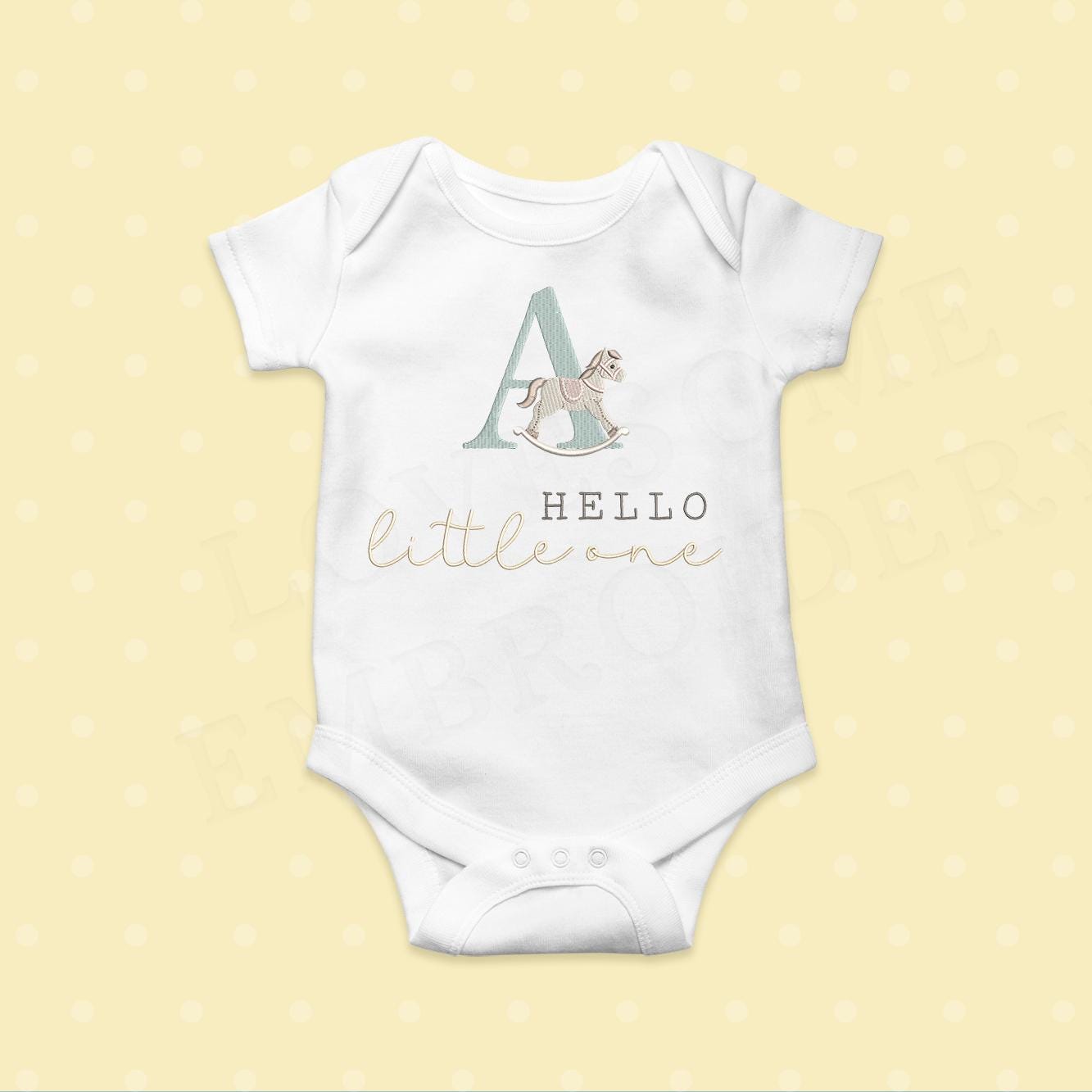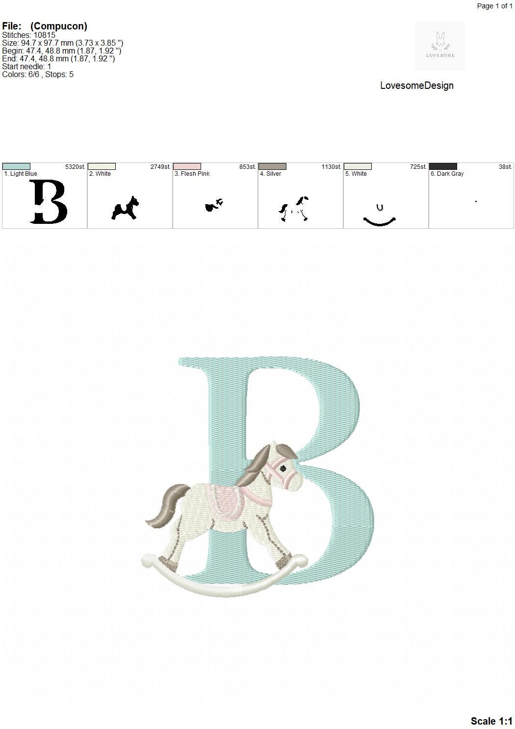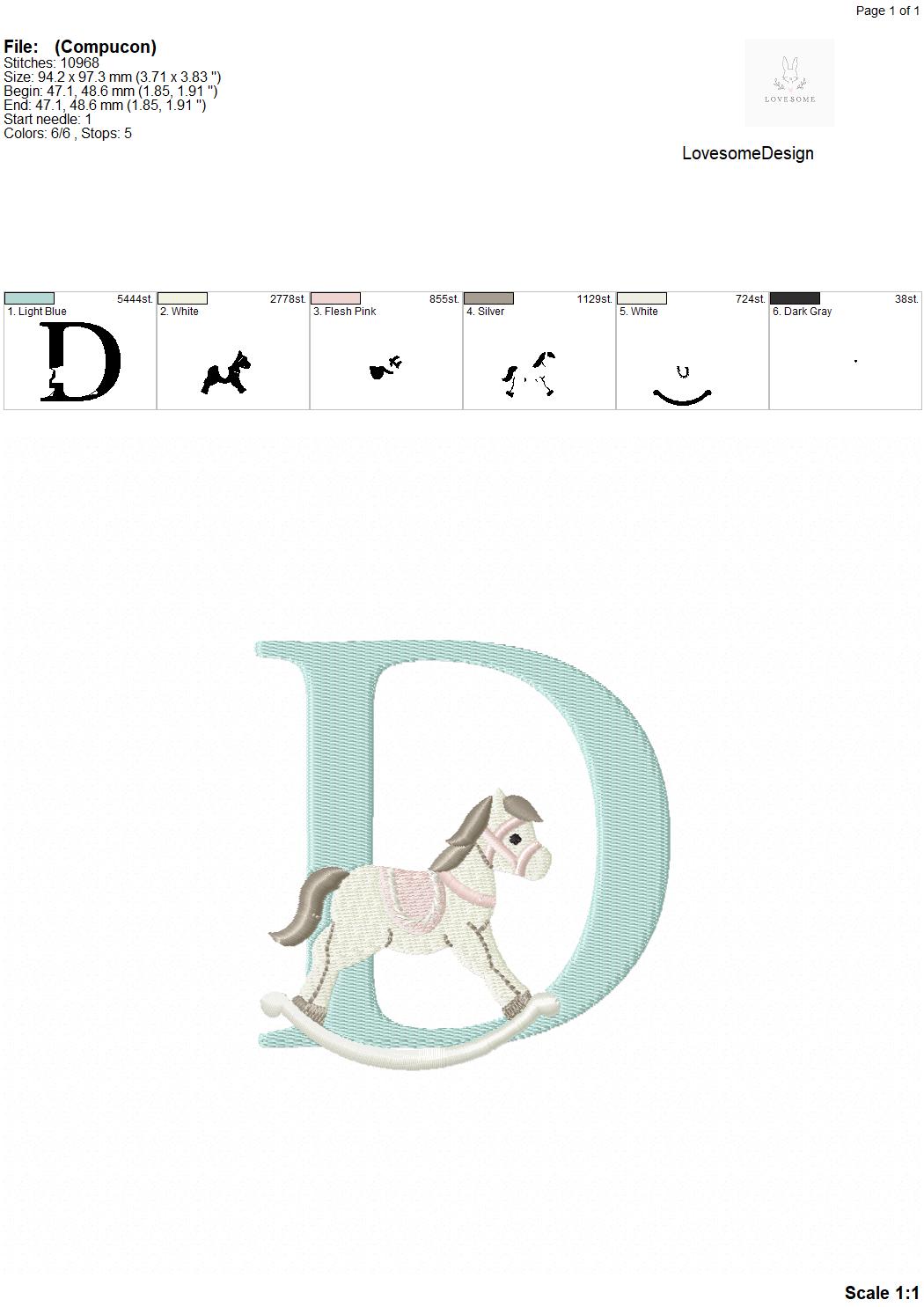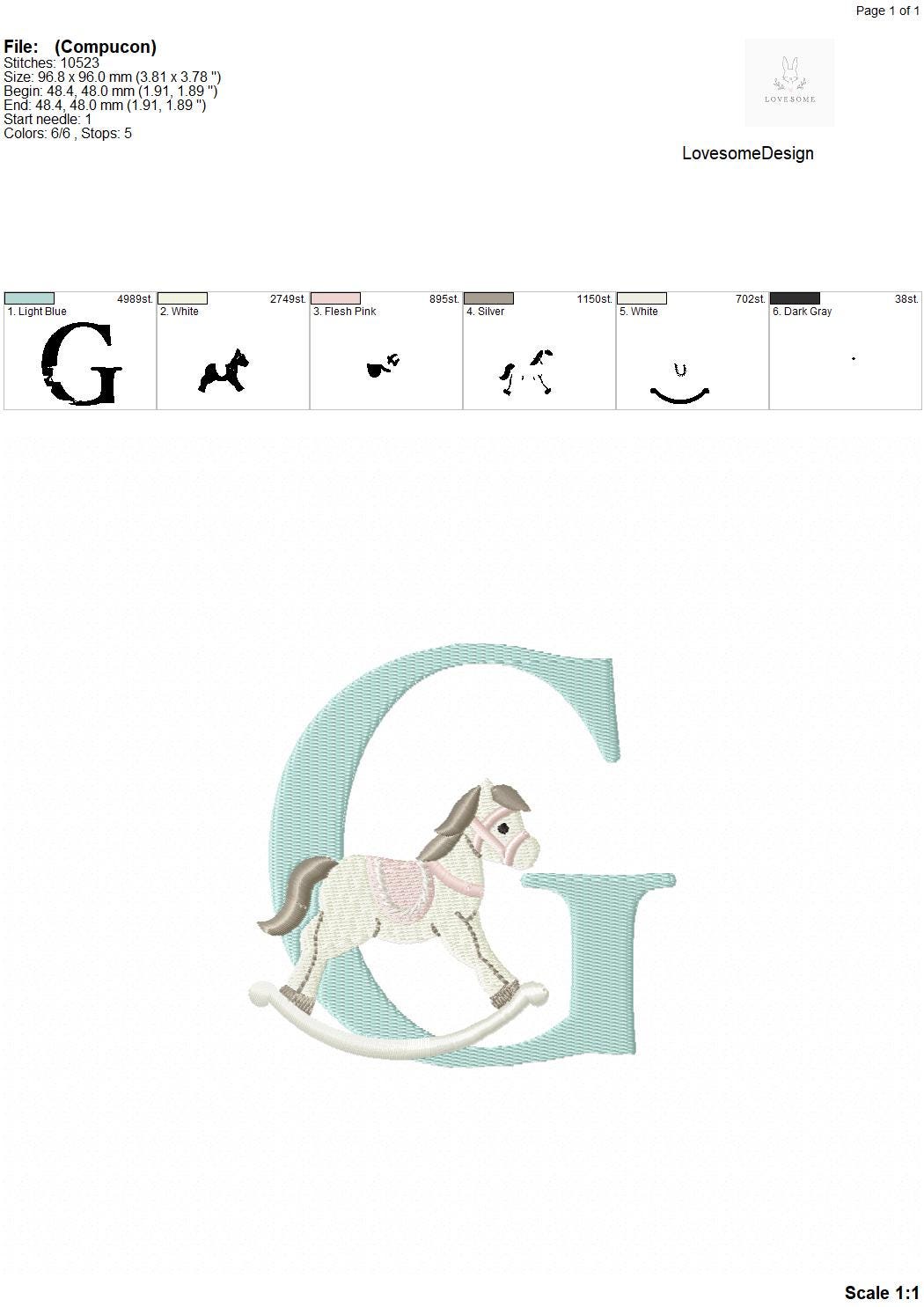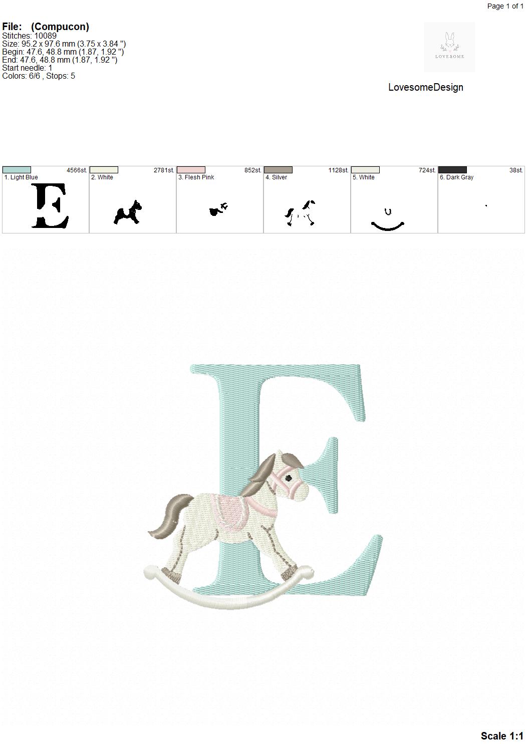 This listing features a machine embroidery font set which includes embroidery files of 26 uppercase monogram letters with cute rocking horse design in 4inch size. (For the whole set, pls see the listing images.)