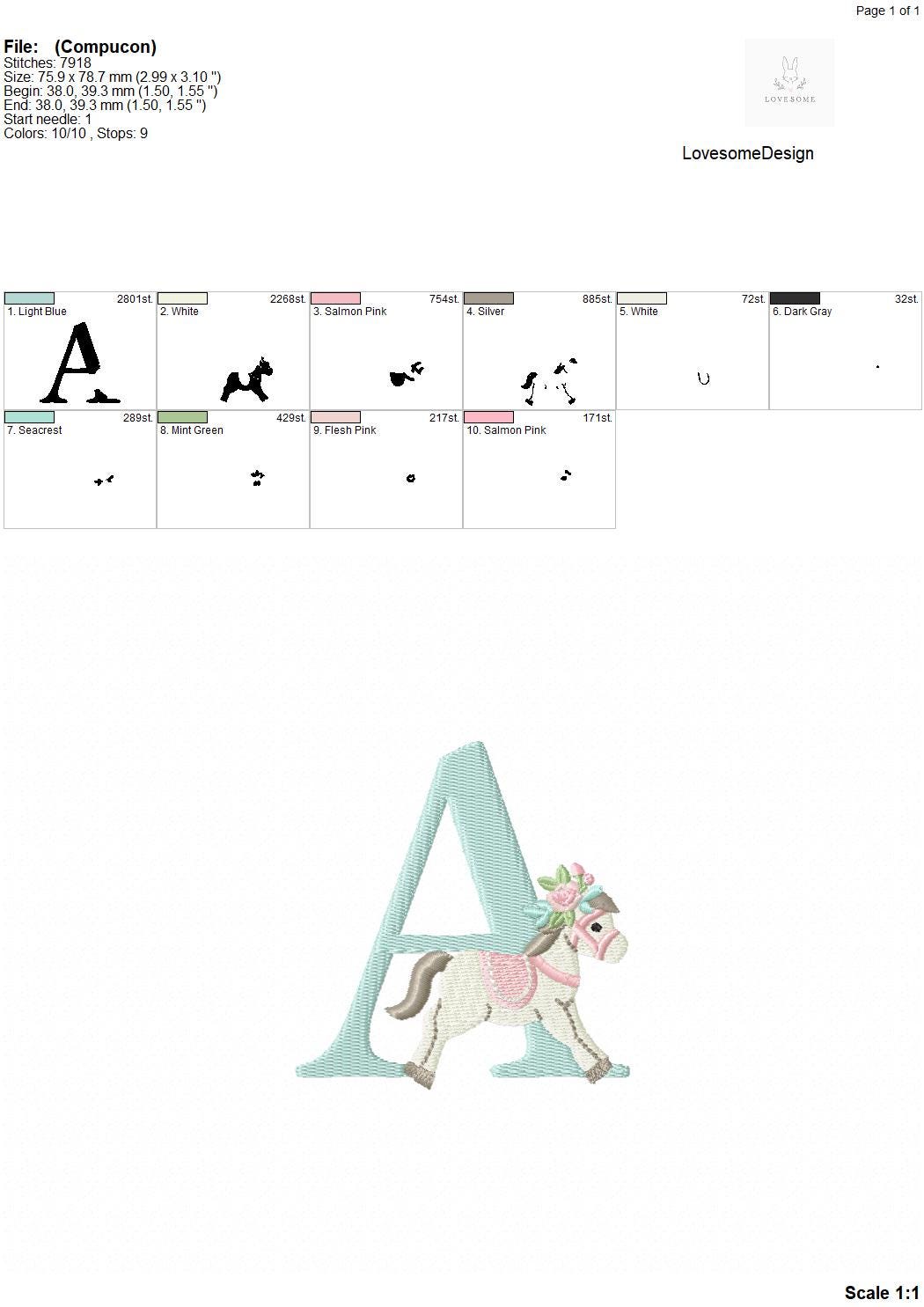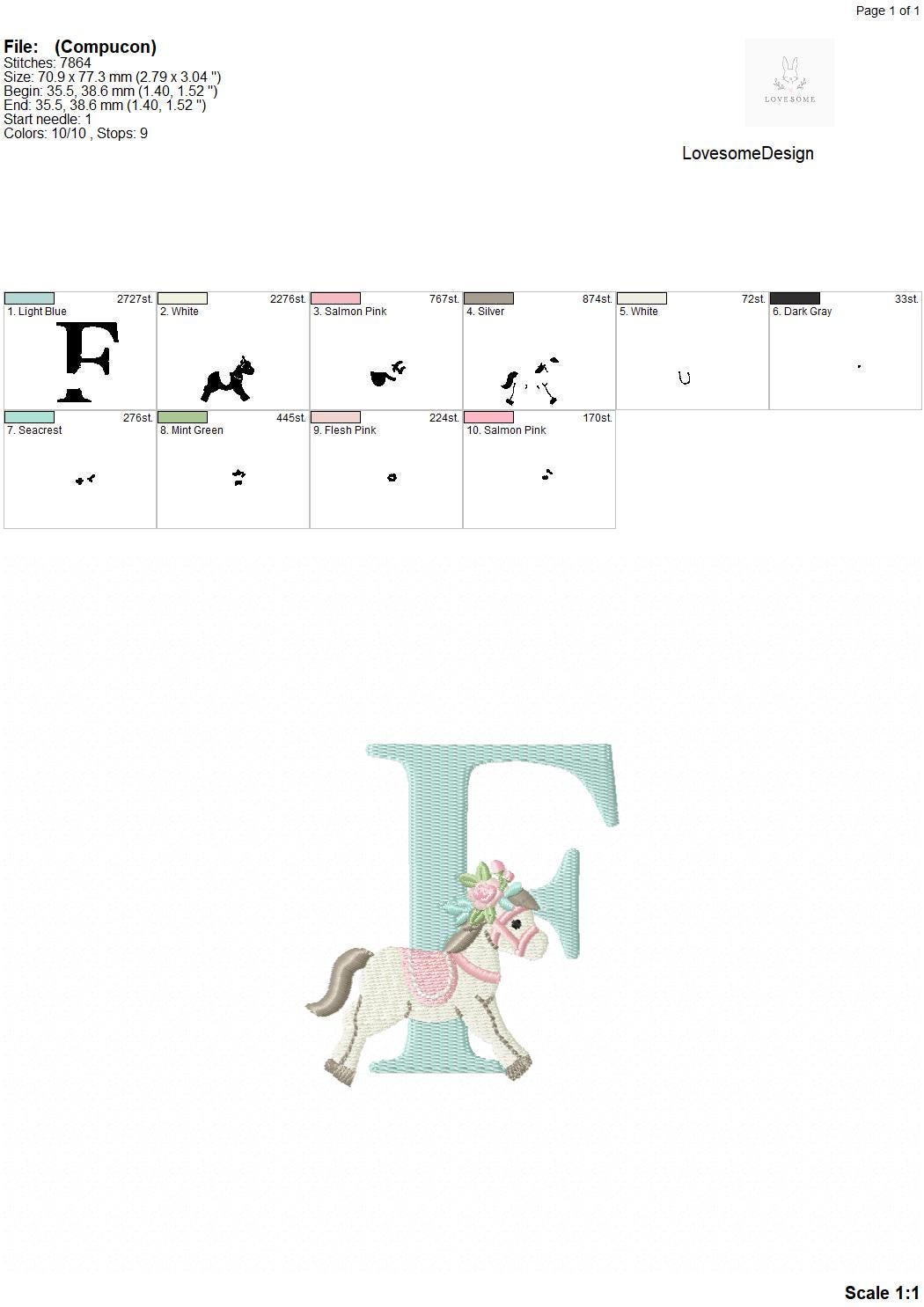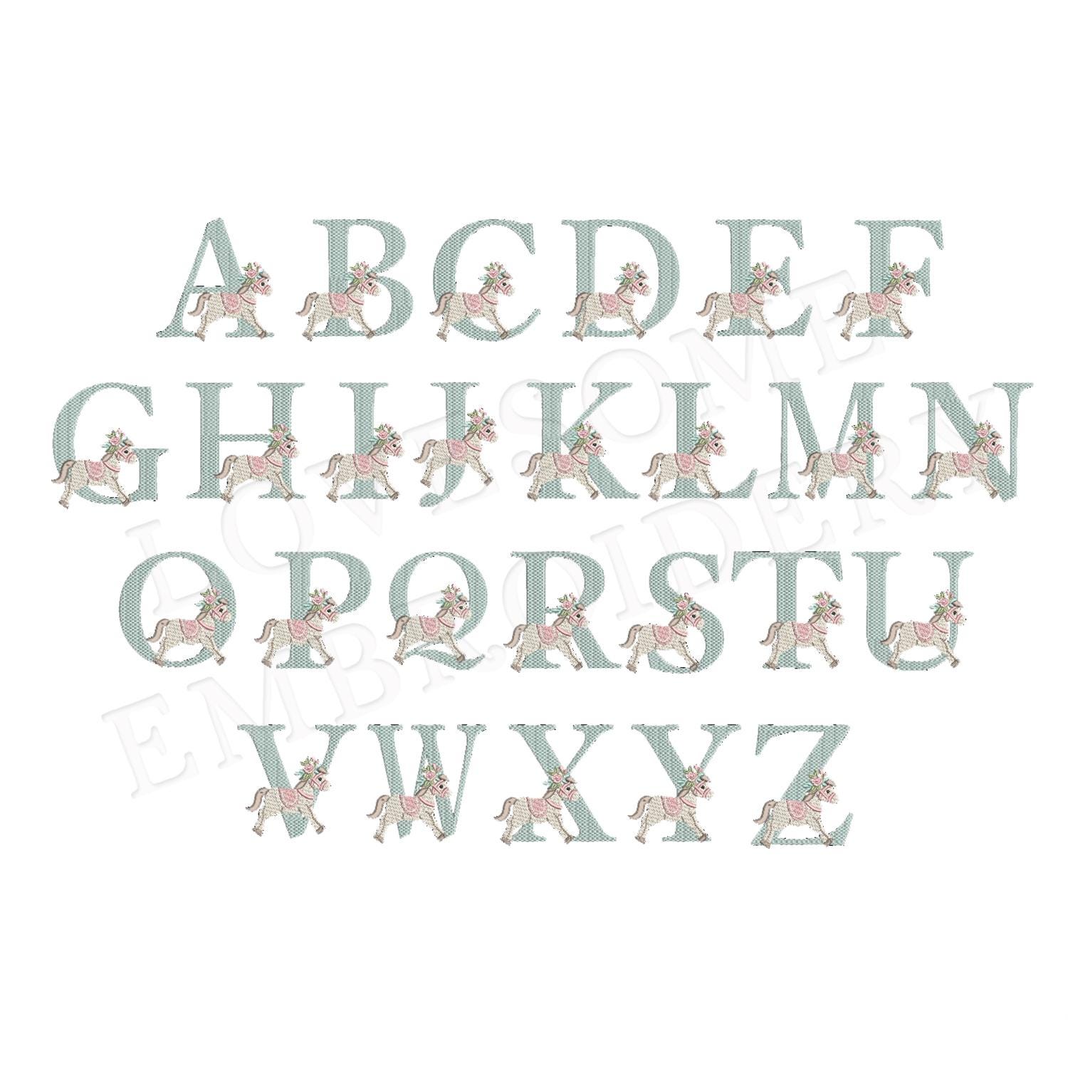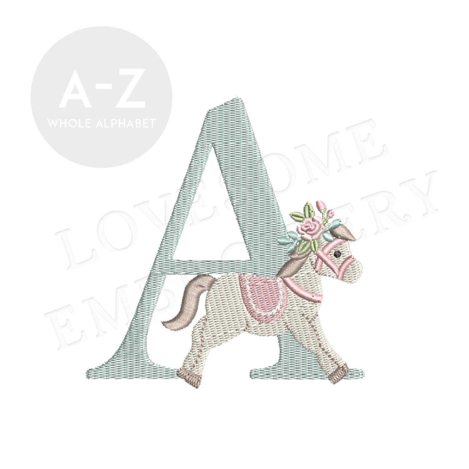 This listing features a machine embroidery font set which includes embroidery files of 26 uppercase monogram letters with cute floral horse design in 3inch size. (For the whole set, pls see the listing images.)