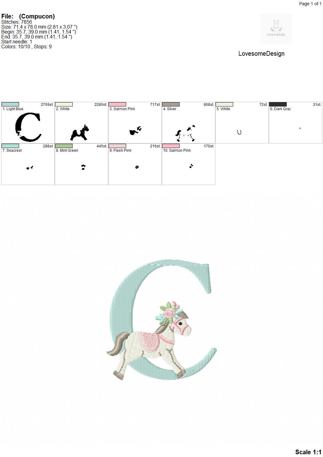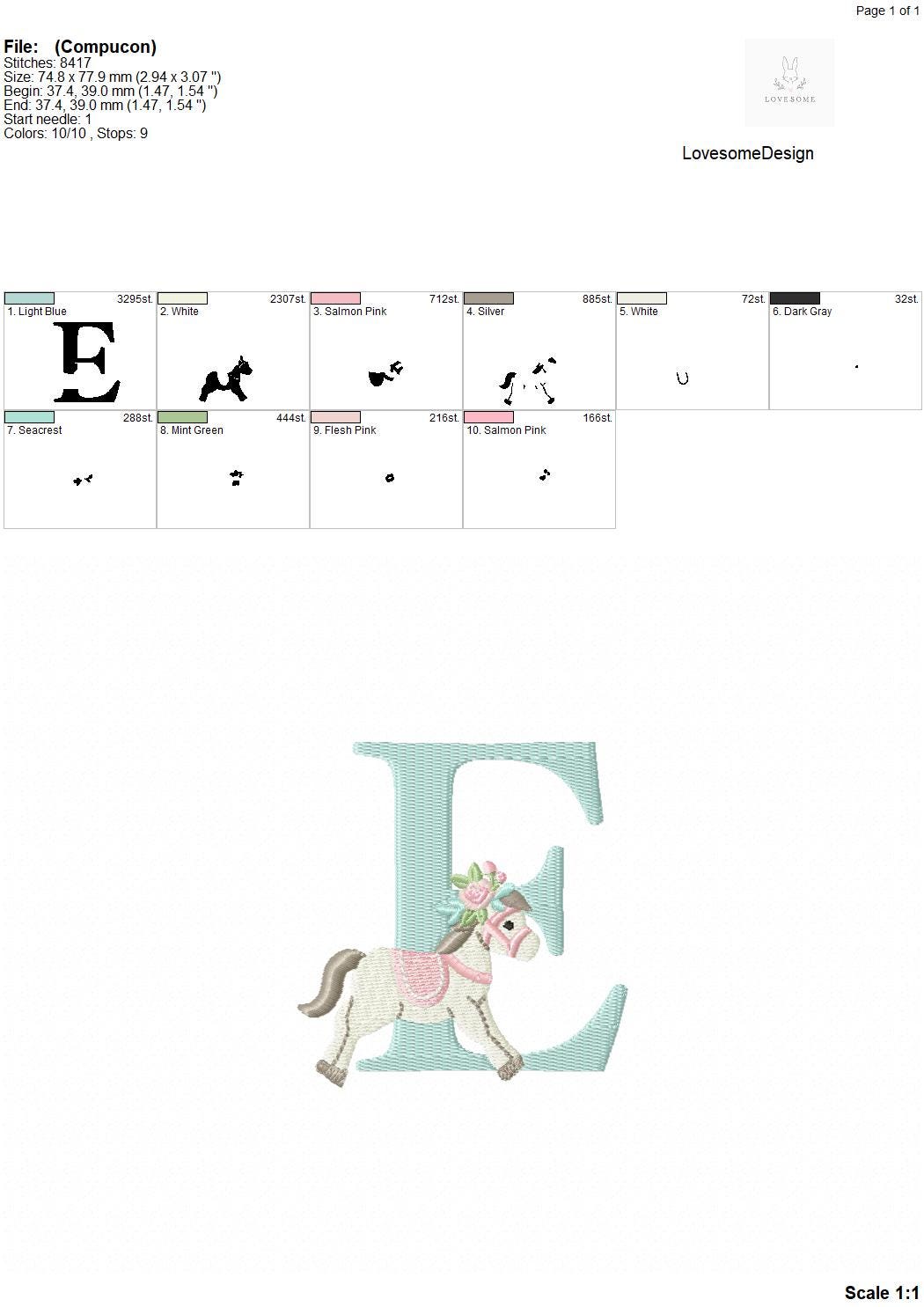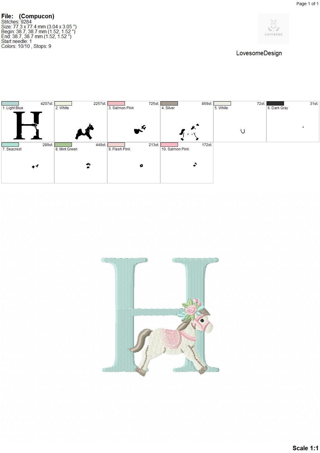 This listing features a machine embroidery font set which includes embroidery files of 26 uppercase monogram letters with cute floral horse design in 3inch size. (For the whole set, pls see the listing images.)
