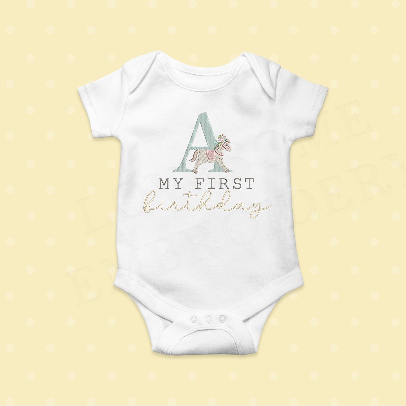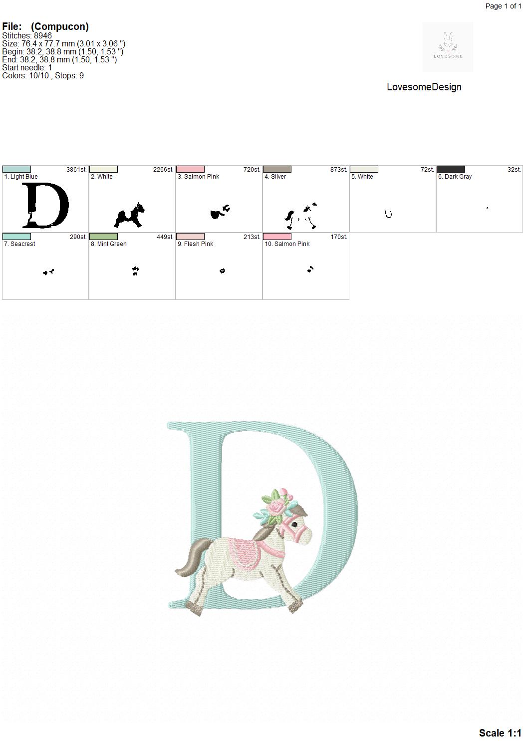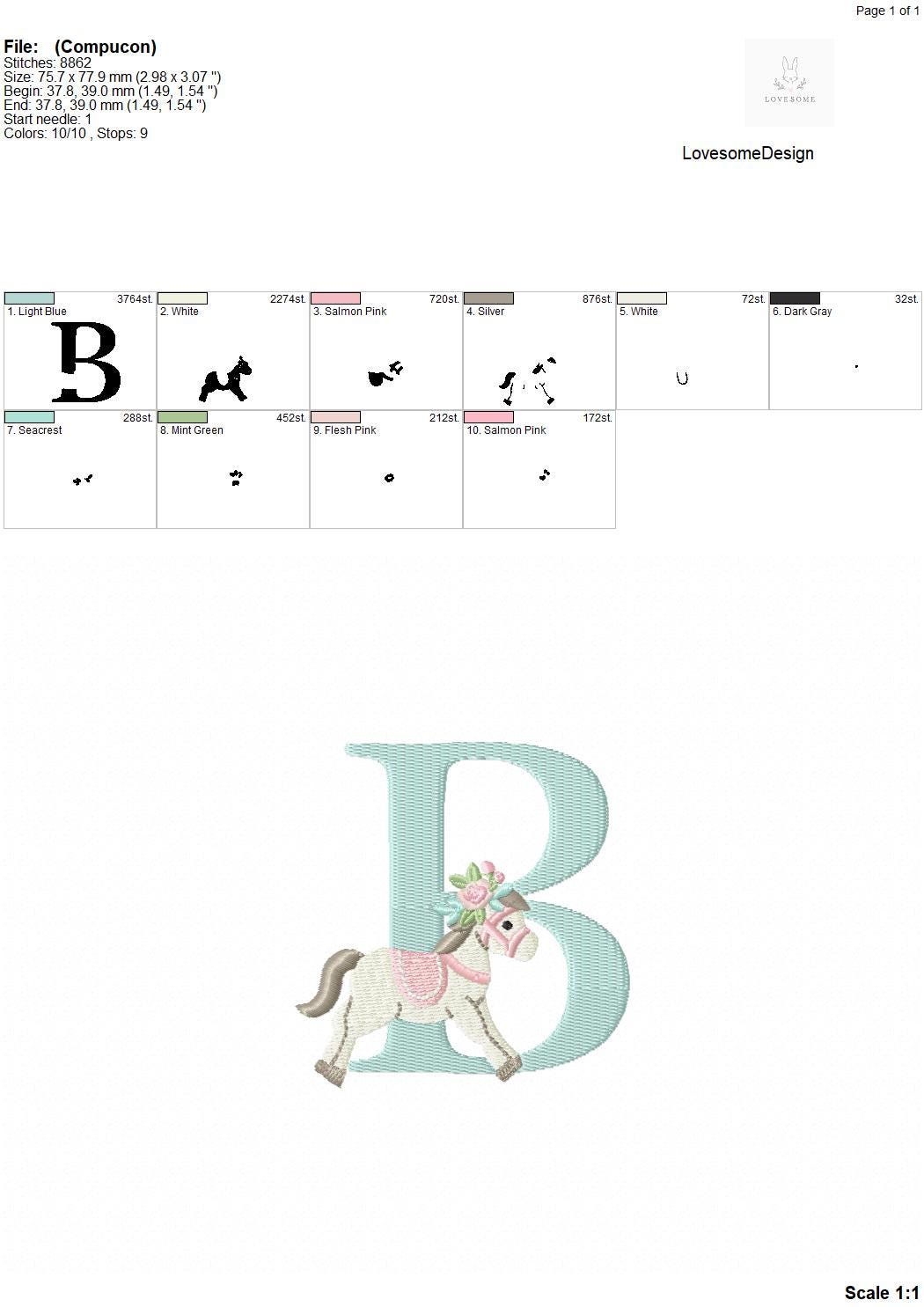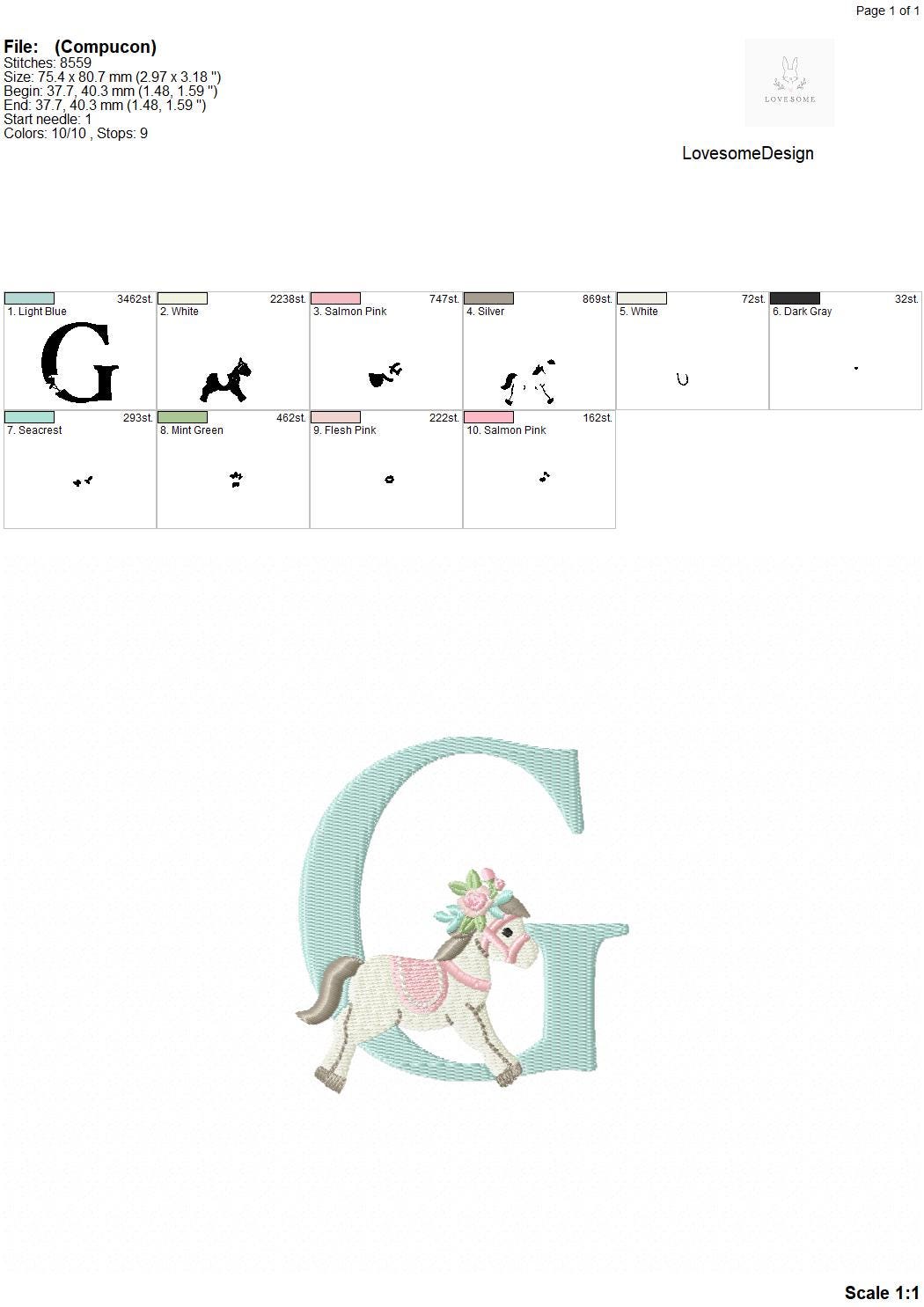 This listing features a machine embroidery font set which includes embroidery files of 26 uppercase monogram letters with cute floral horse design in 3inch size. (For the whole set, pls see the listing images.)