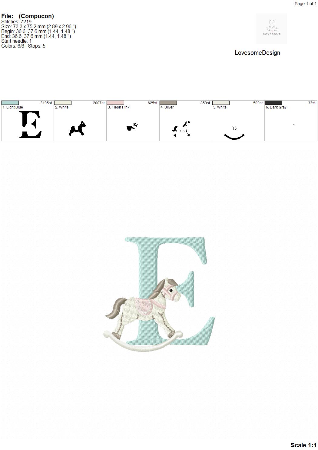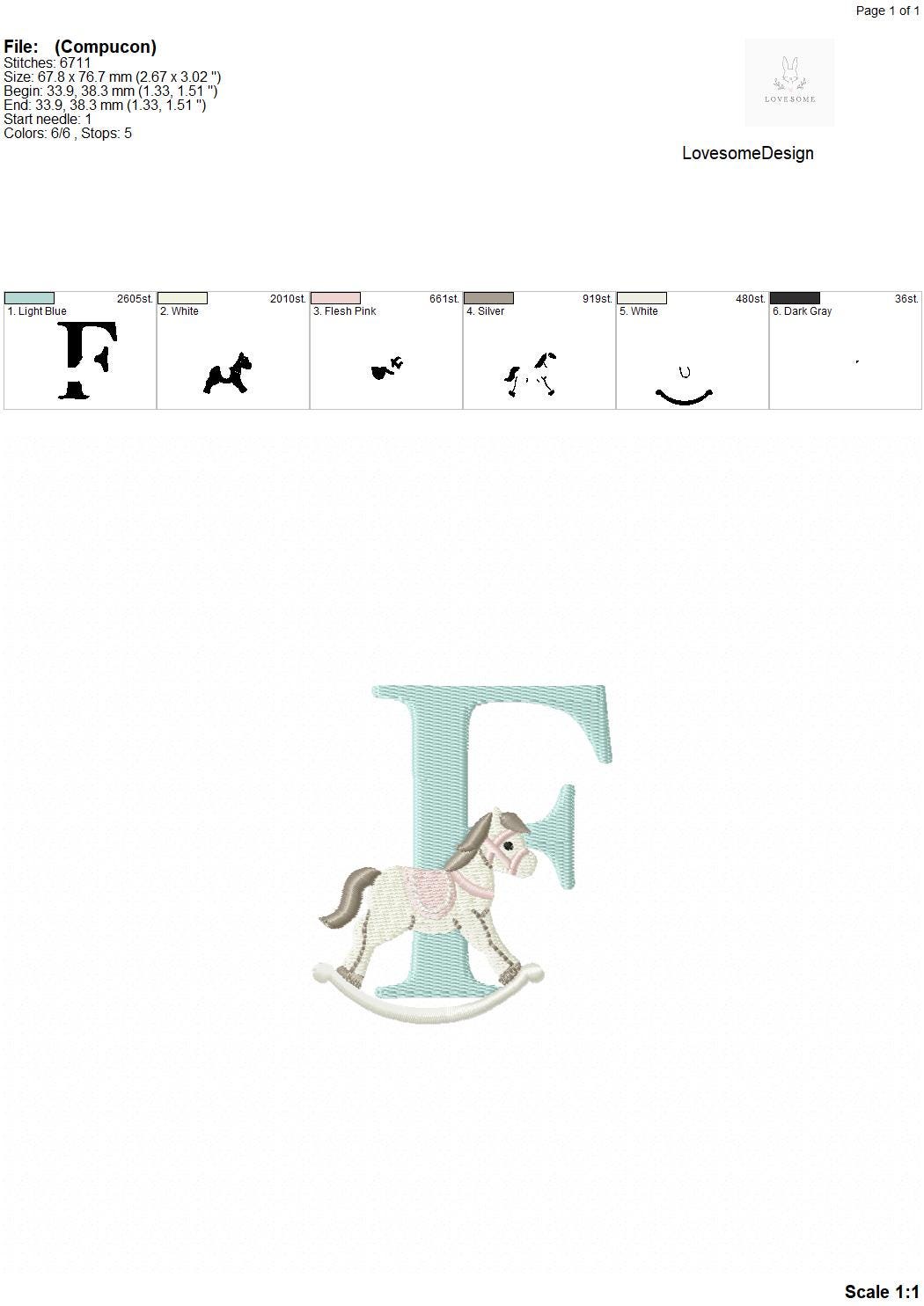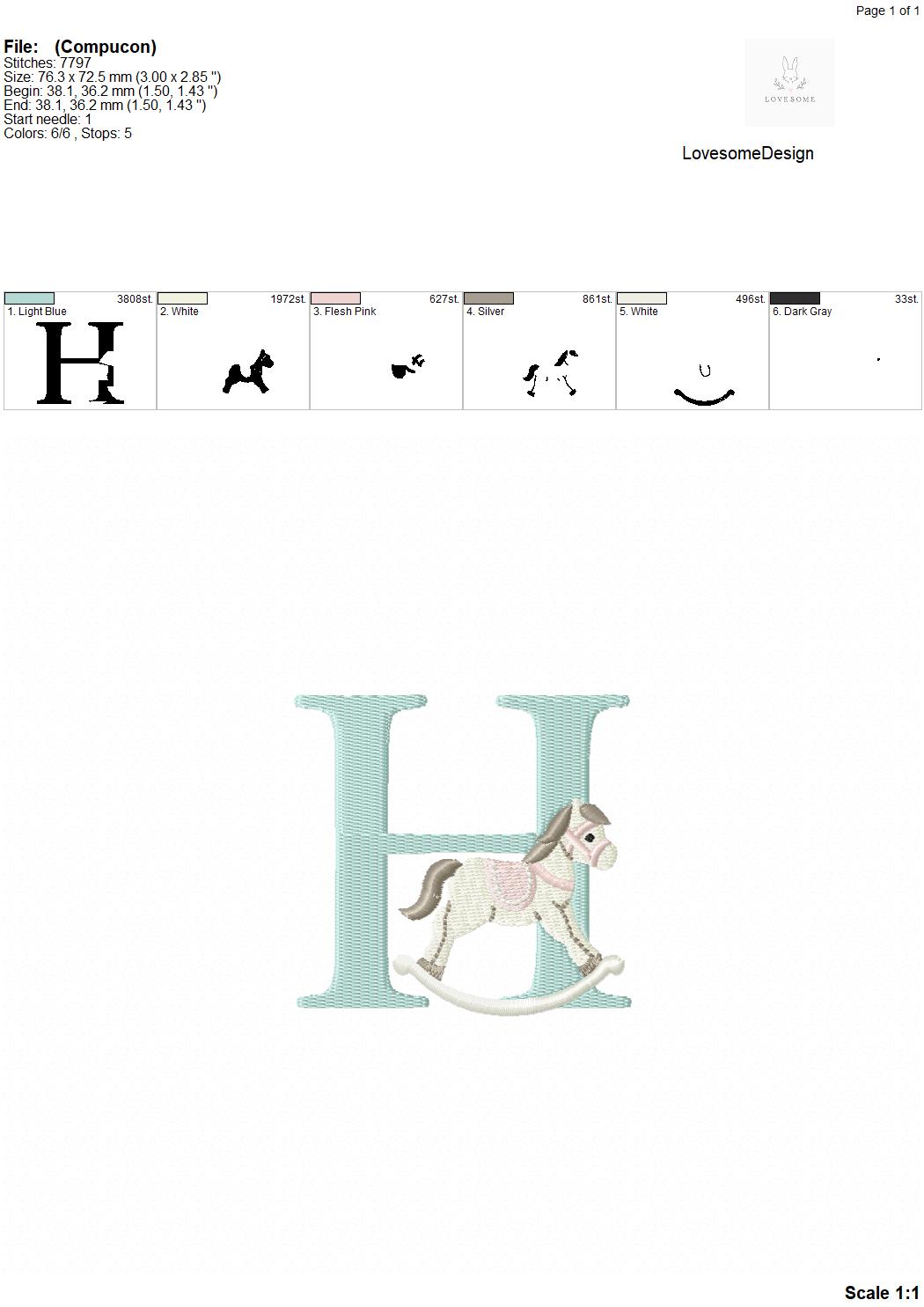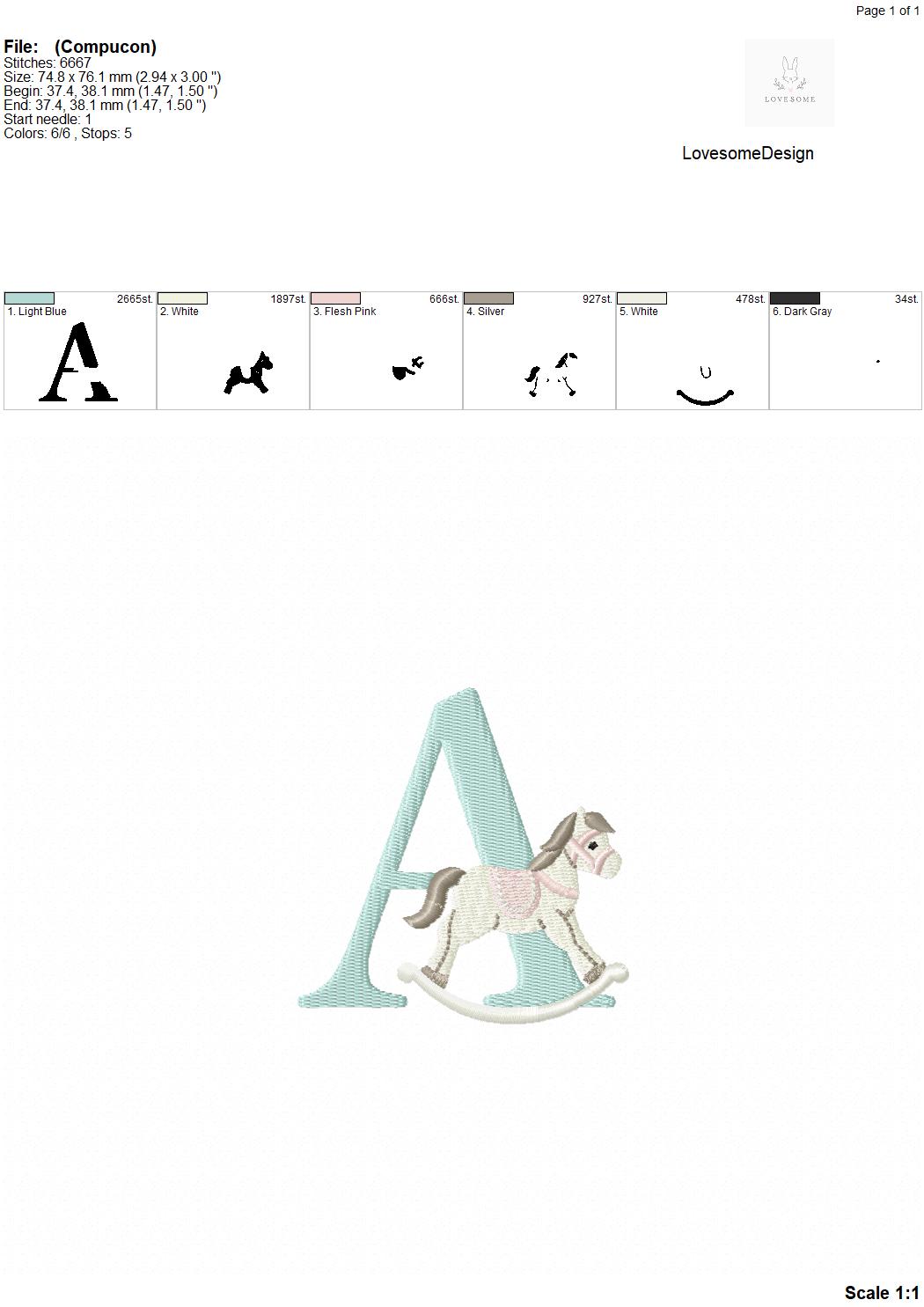 This listing features a machine embroidery font set which includes embroidery files of 26 uppercase monogram letters with cute rocking horse design in 3inch size. (For the whole set, pls see the listing images.)