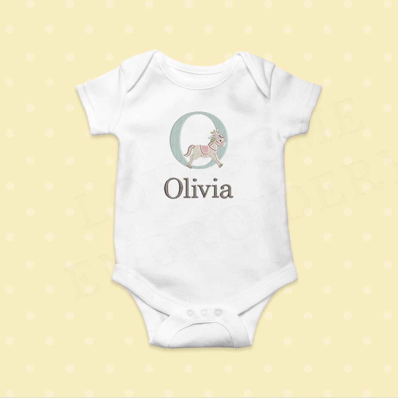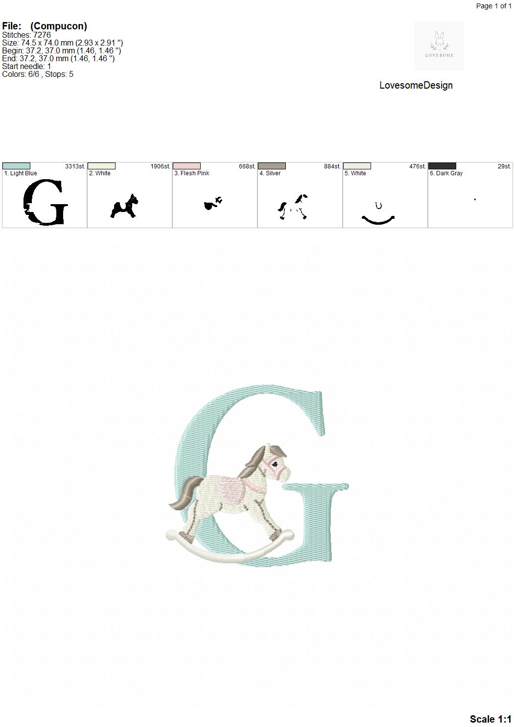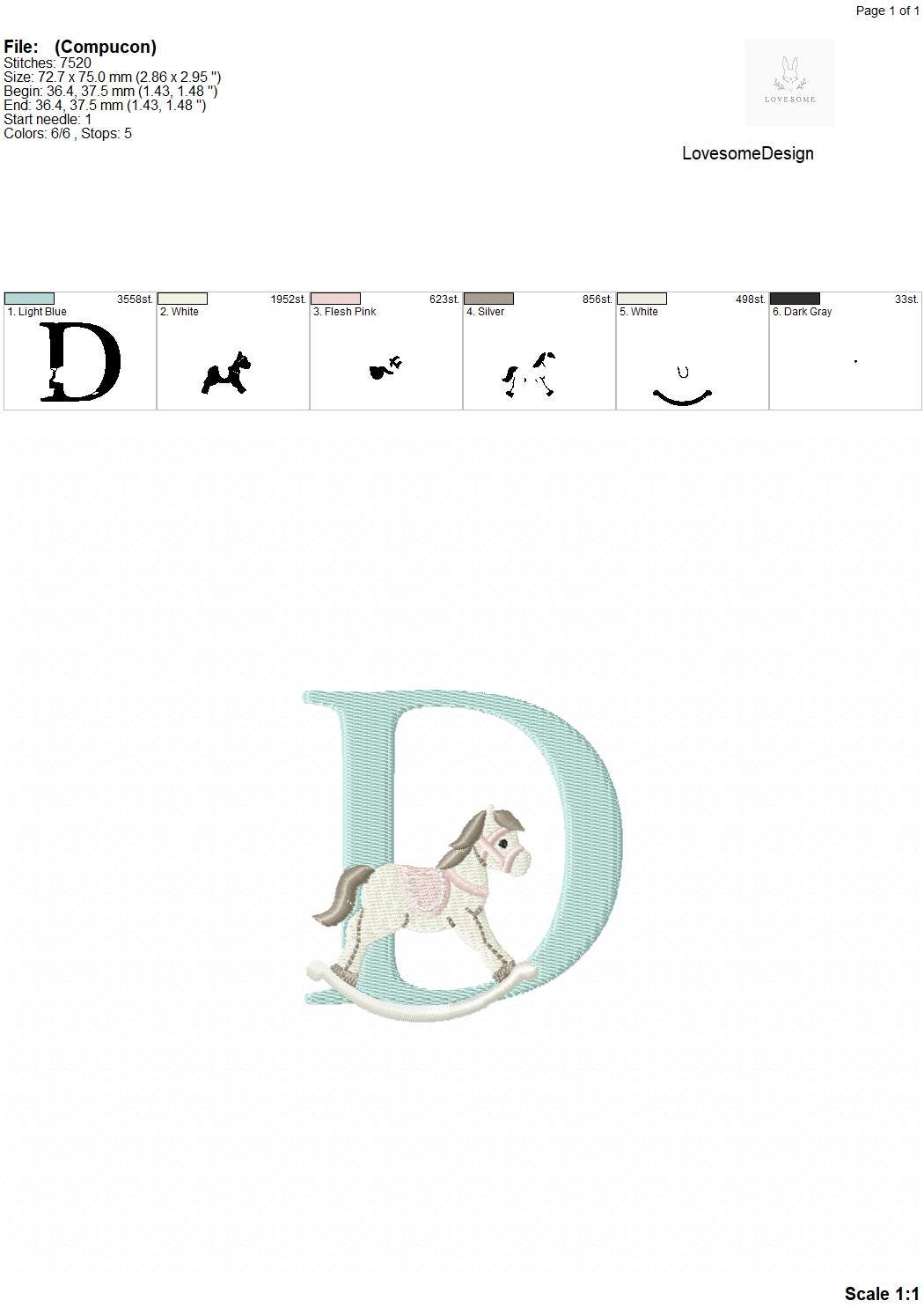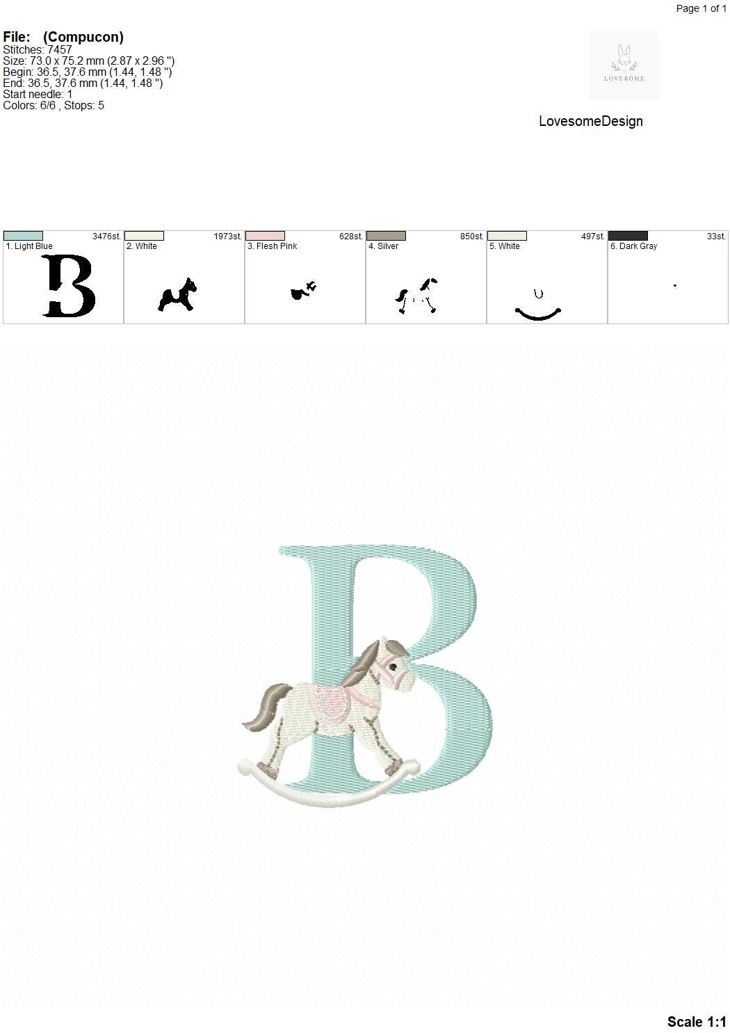 This listing features a machine embroidery font set which includes embroidery files of 26 uppercase monogram letters with cute rocking horse design in 3inch size. (For the whole set, pls see the listing images.)