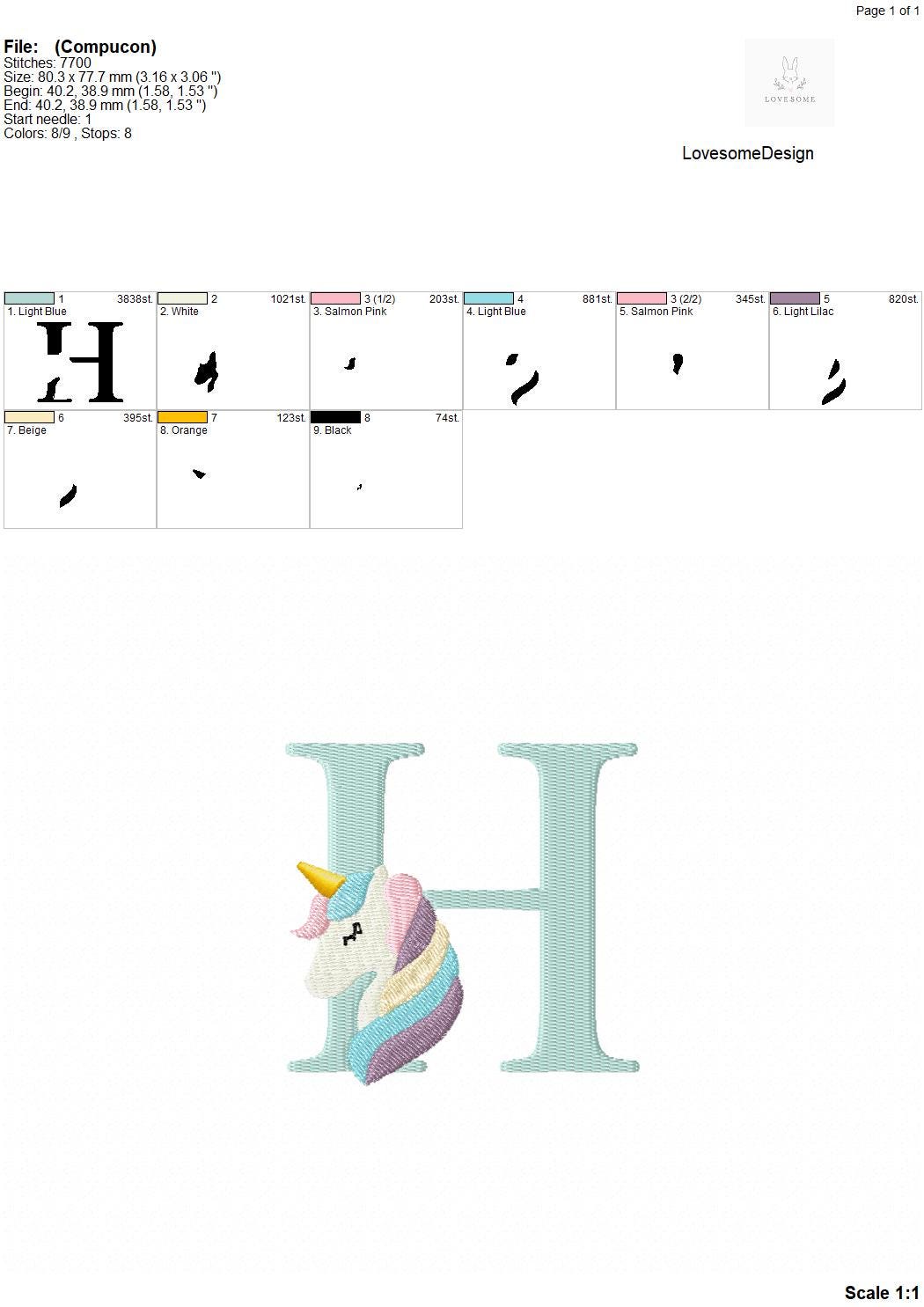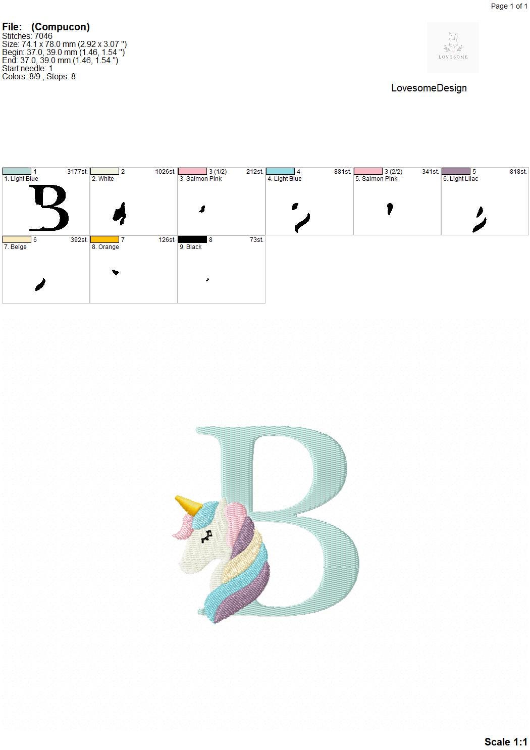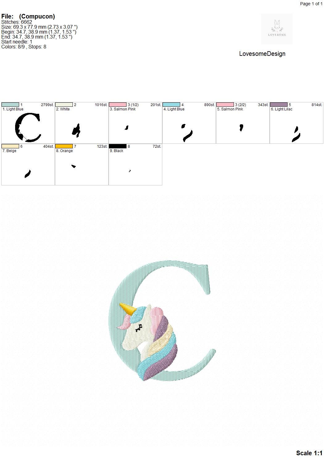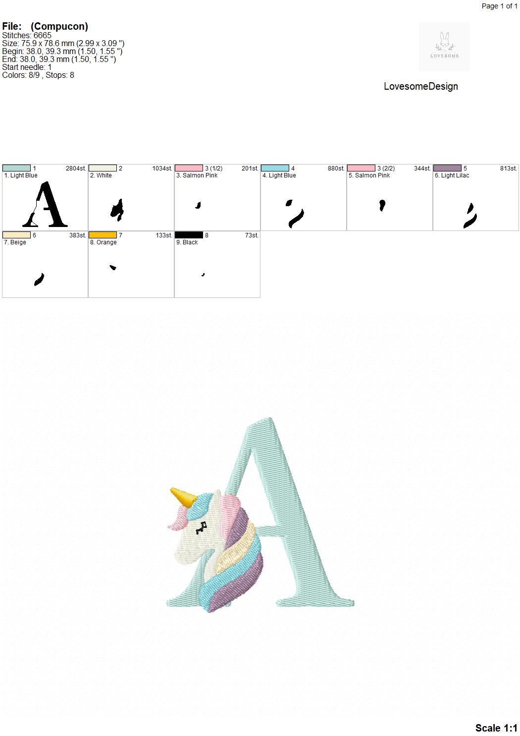 This listing features a machine embroidery font set which includes embroidery files of 26 uppercase monogram letters with cute unicorn design in 3inch size. (For the whole set, pls see the listing images.)