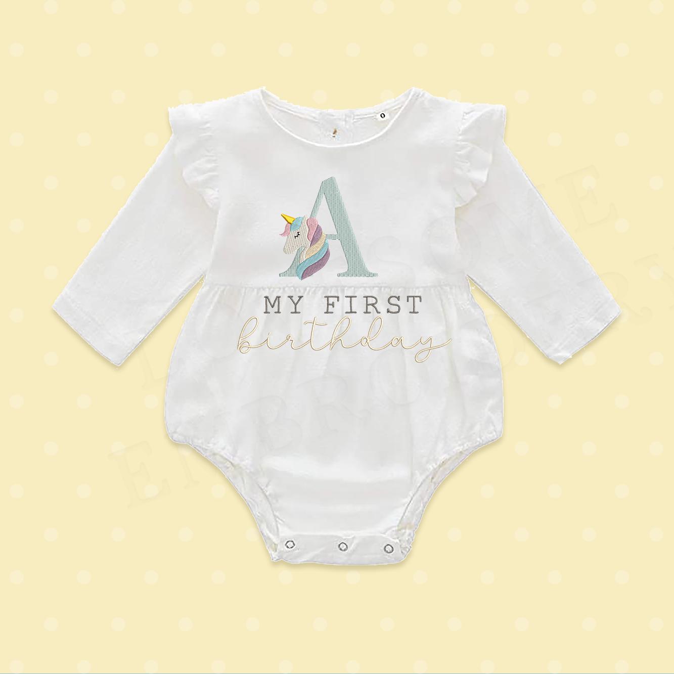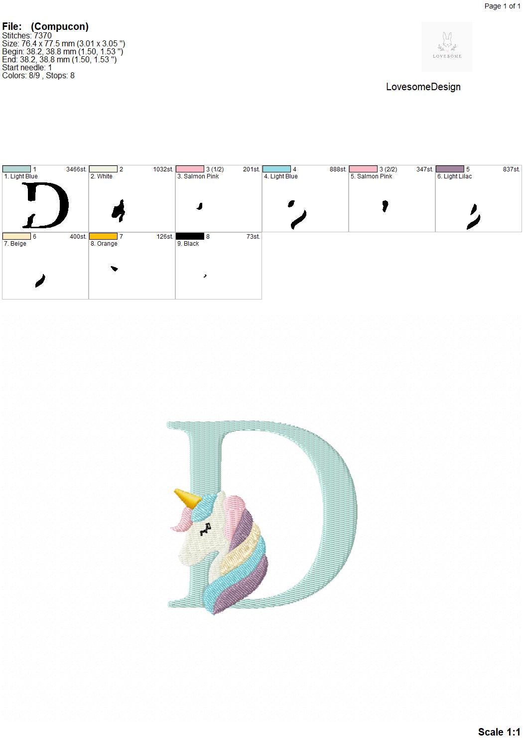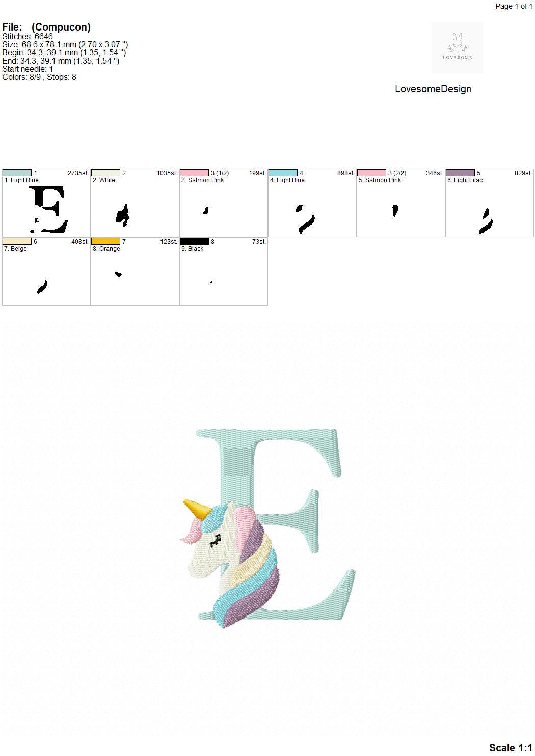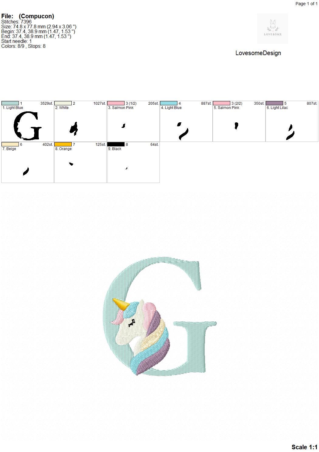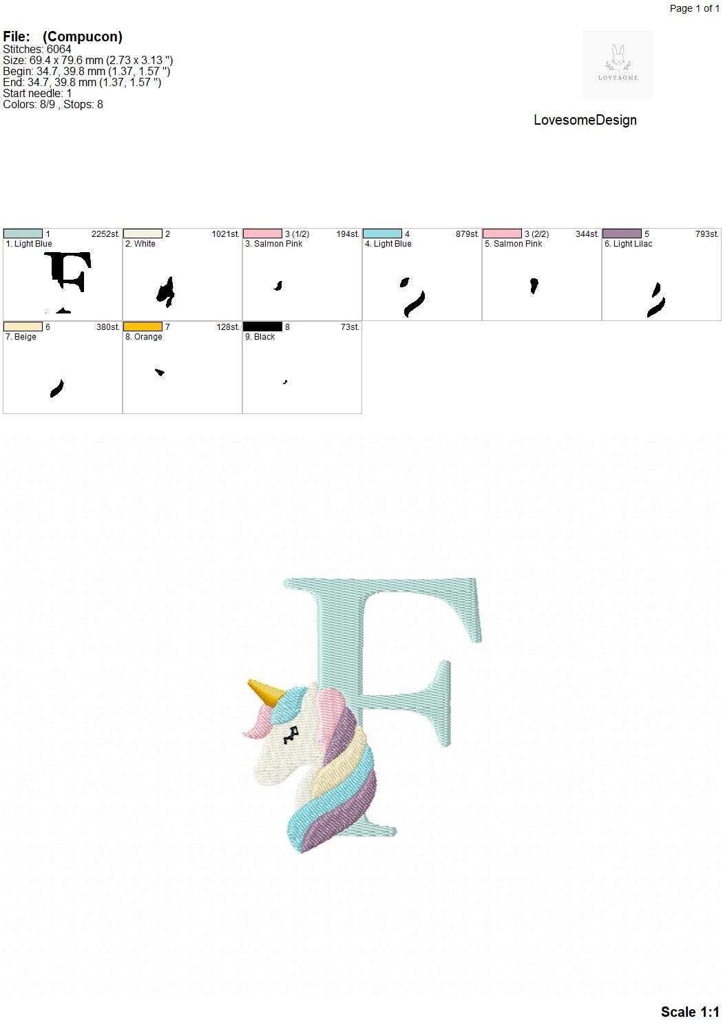 This listing features a machine embroidery font set which includes embroidery files of 26 uppercase monogram letters with cute unicorn design in 3inch size. (For the whole set, pls see the listing images.)