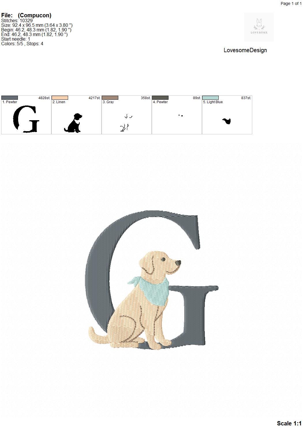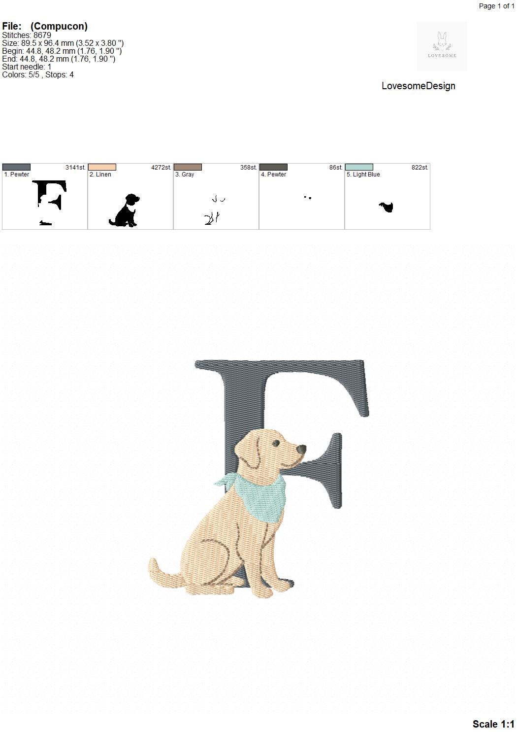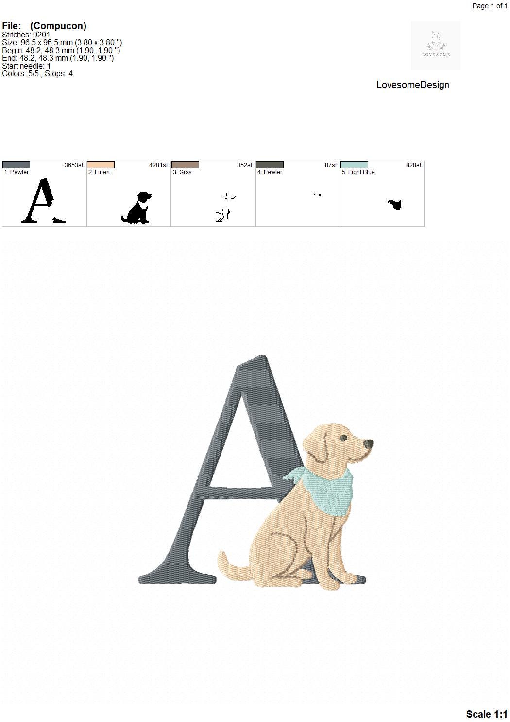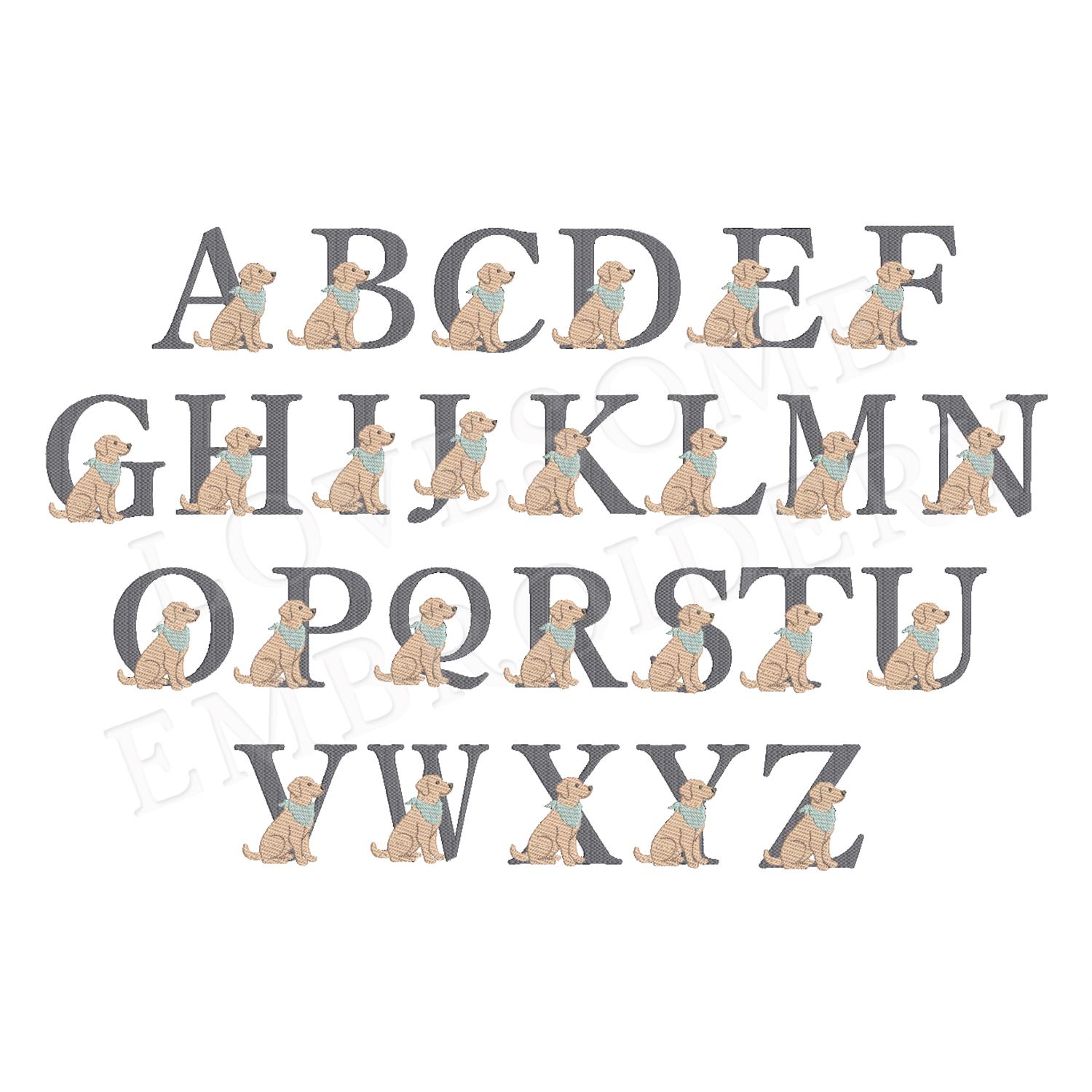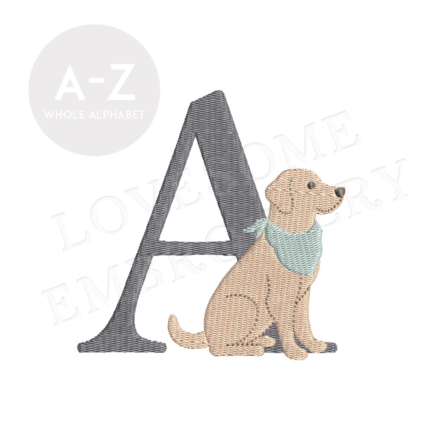This listing features a machine embroidery font set which includes embroidery files of 26 uppercase monogram letters with cute golden retriever labrador dog design wearing a cute bandana in 4inch size. (For the whole set, pls see the listing images.)