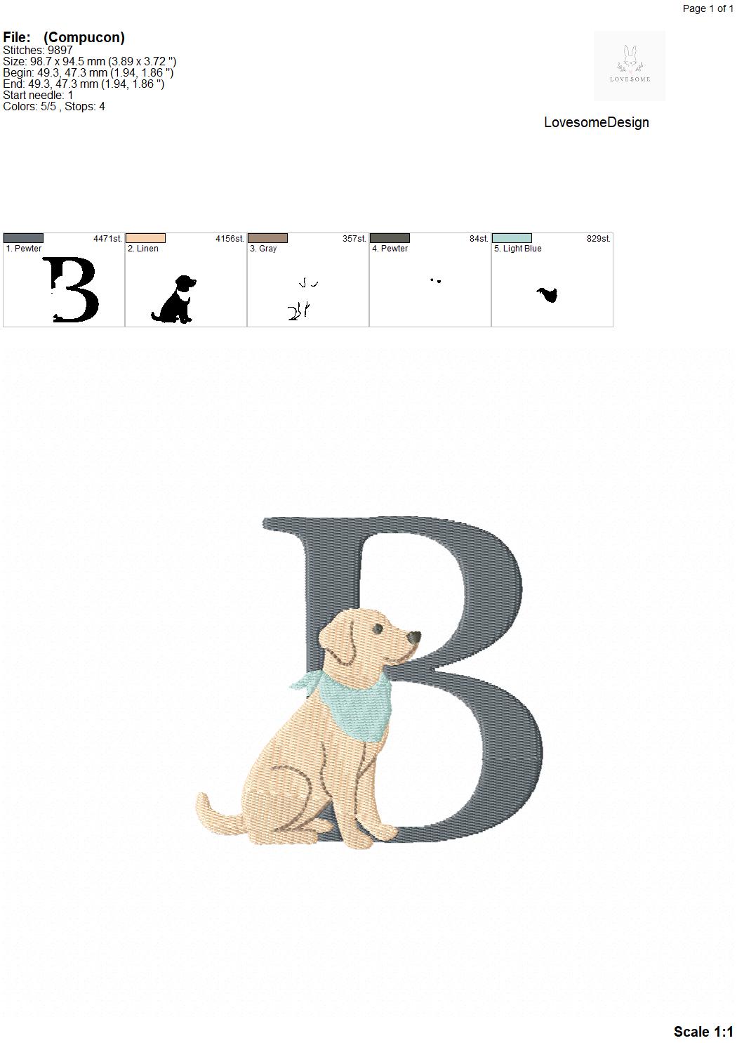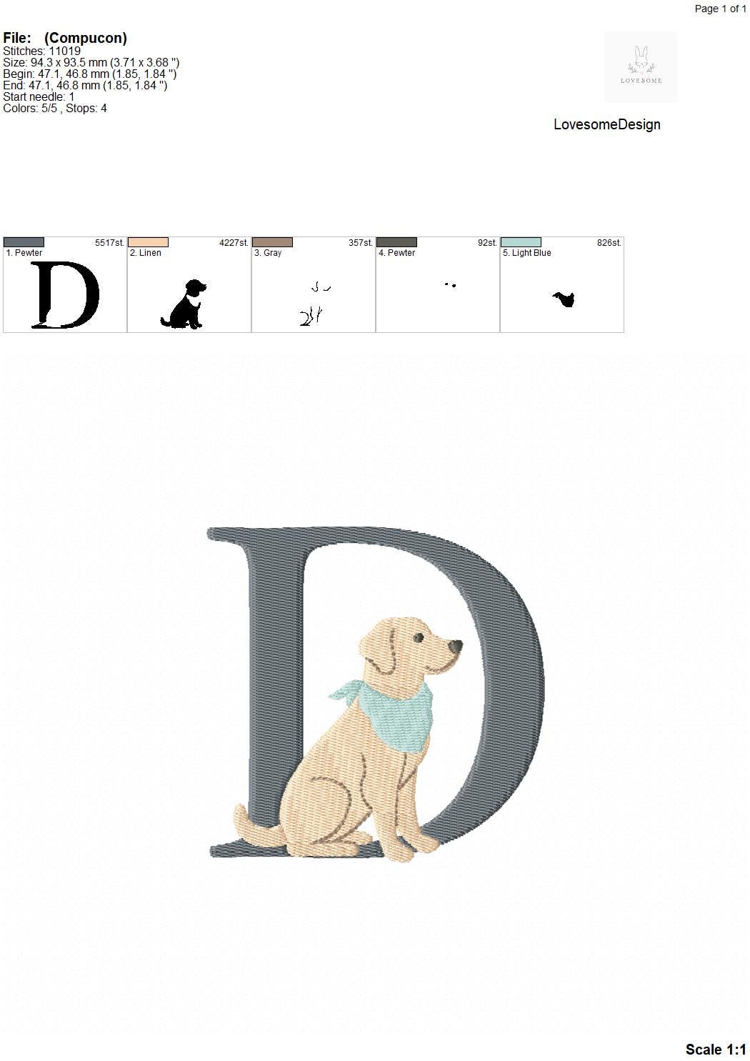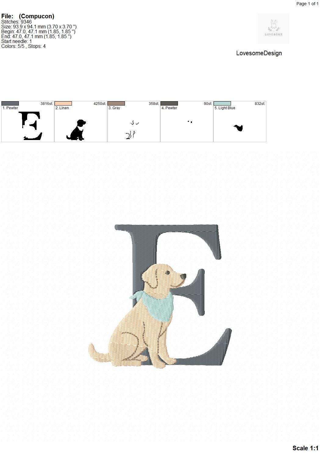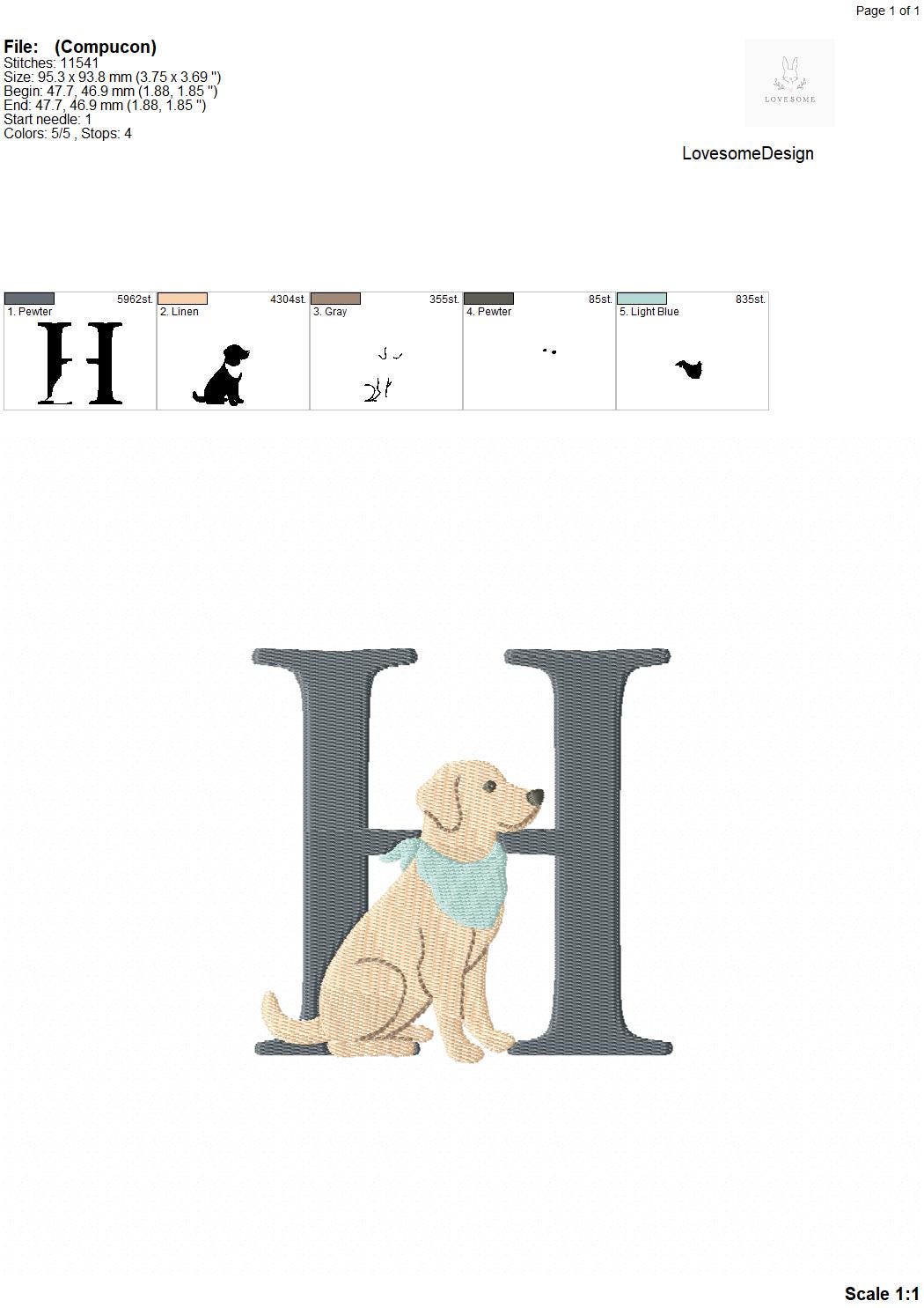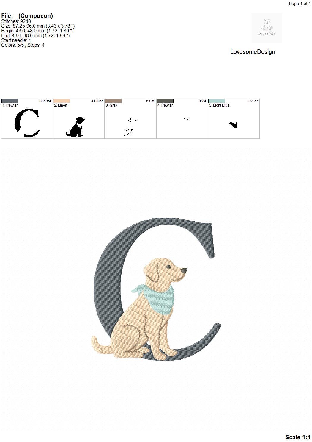 This listing features a machine embroidery font set which includes embroidery files of 26 uppercase monogram letters with cute golden retriever labrador dog design wearing a cute bandana in 4inch size. (For the whole set, pls see the listing images.)