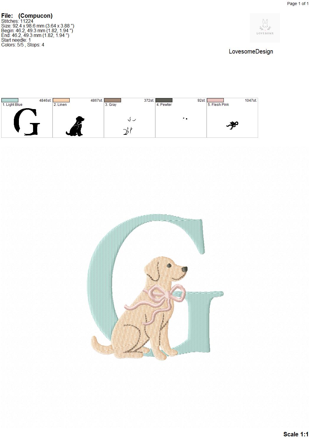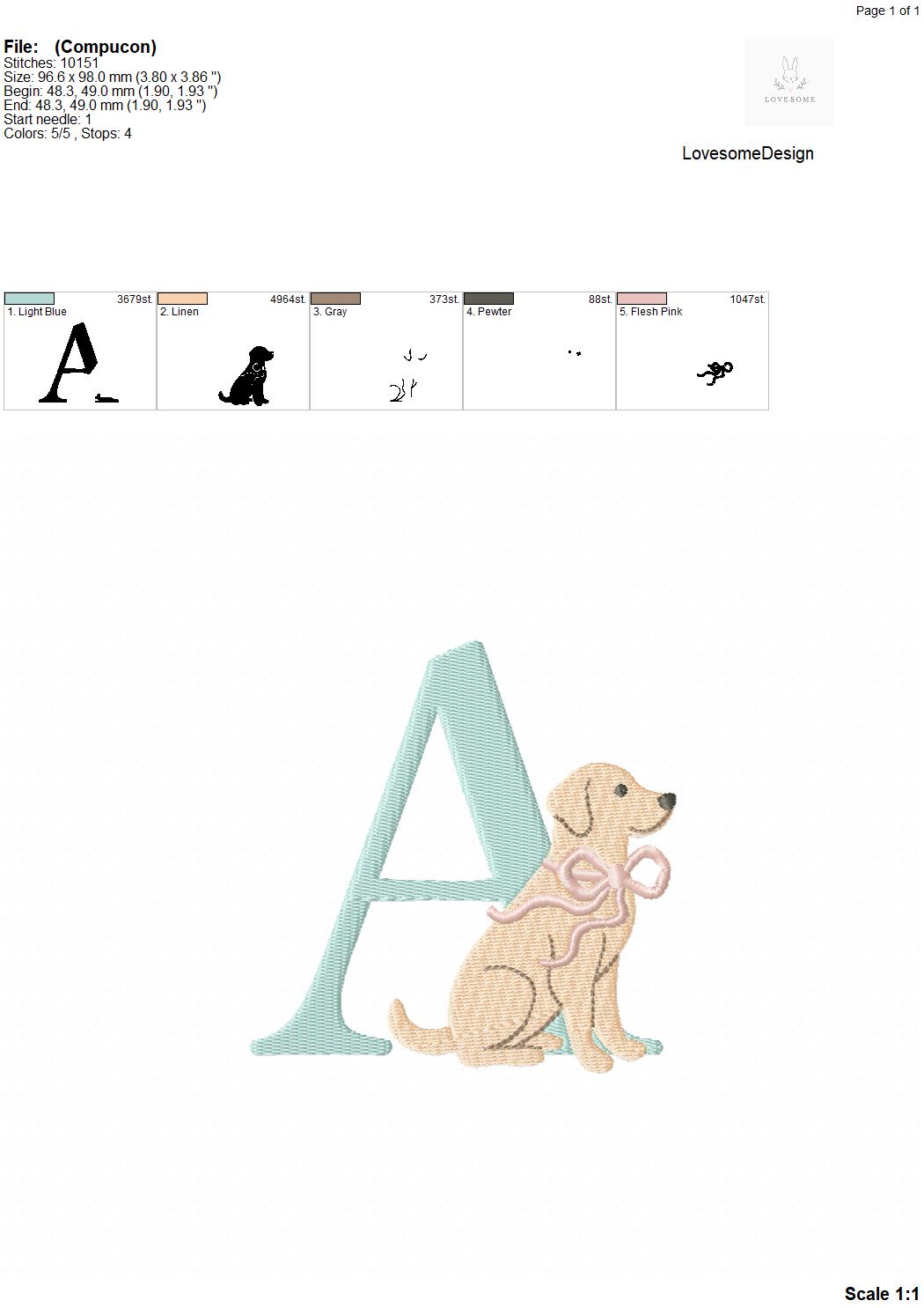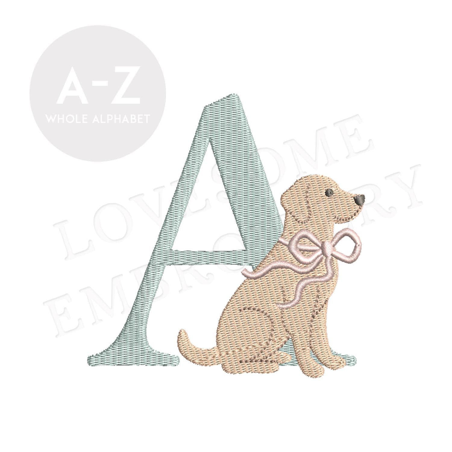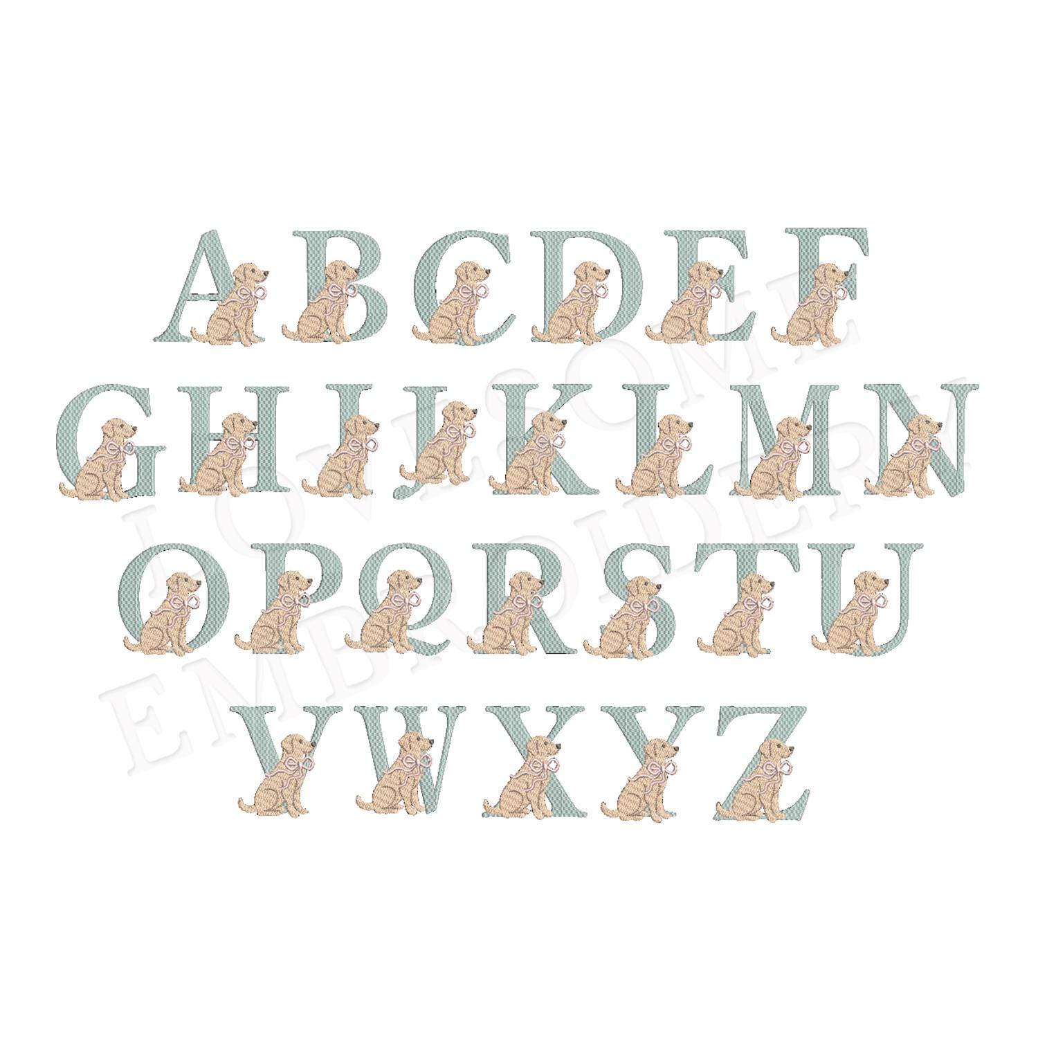 This listing features a machine embroidery font set which includes embroidery files of 26 uppercase monogram letters with cute golden retriever labrador dog design wearing a cute bow in 4inch size. (For the whole set, pls see the listing images.)