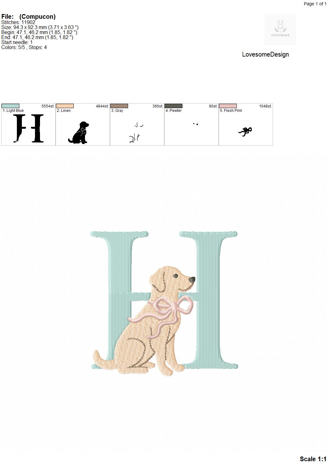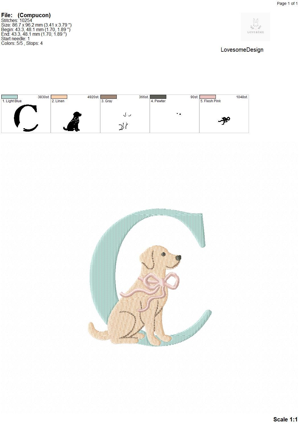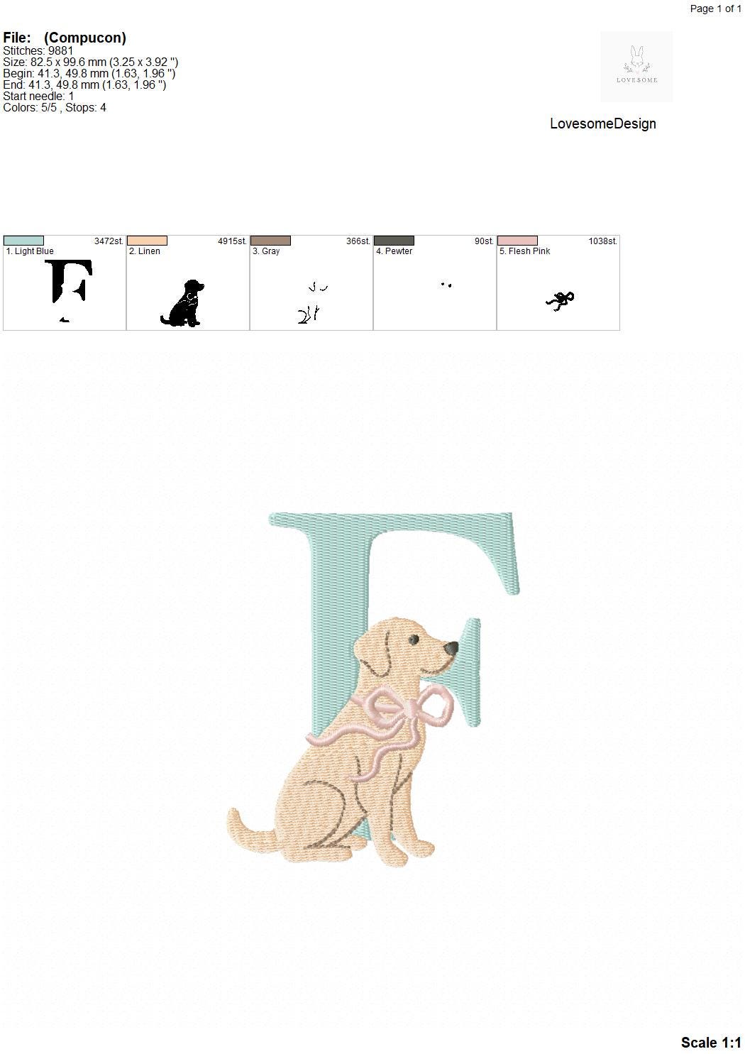 This listing features a machine embroidery font set which includes embroidery files of 26 uppercase monogram letters with cute golden retriever labrador dog design wearing a cute bow in 4inch size. (For the whole set, pls see the listing images.)