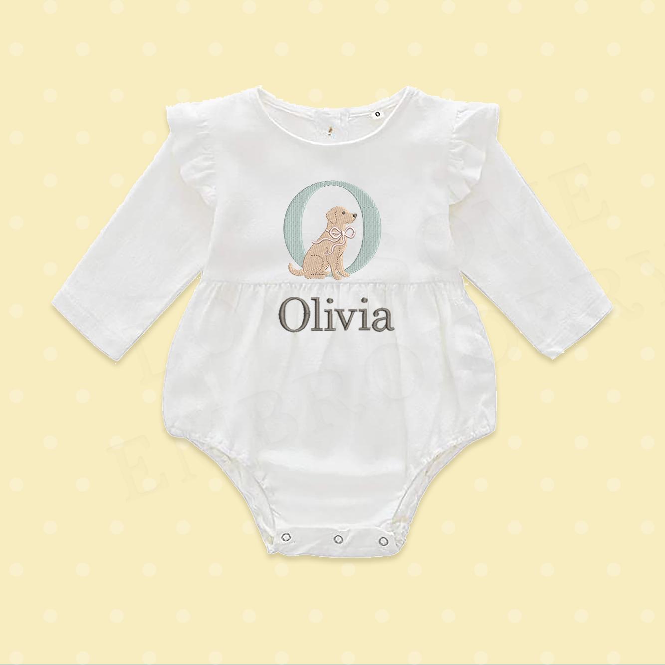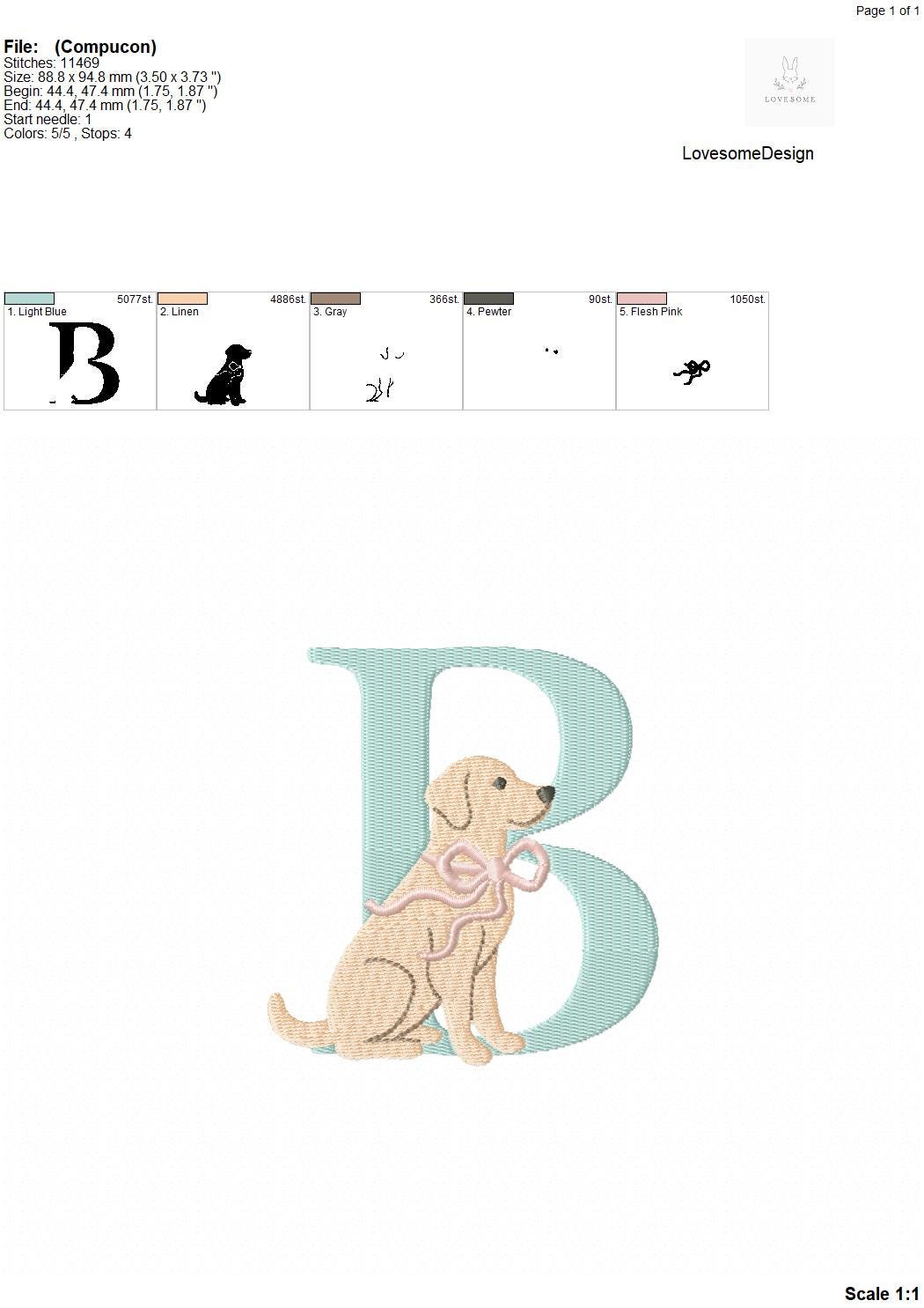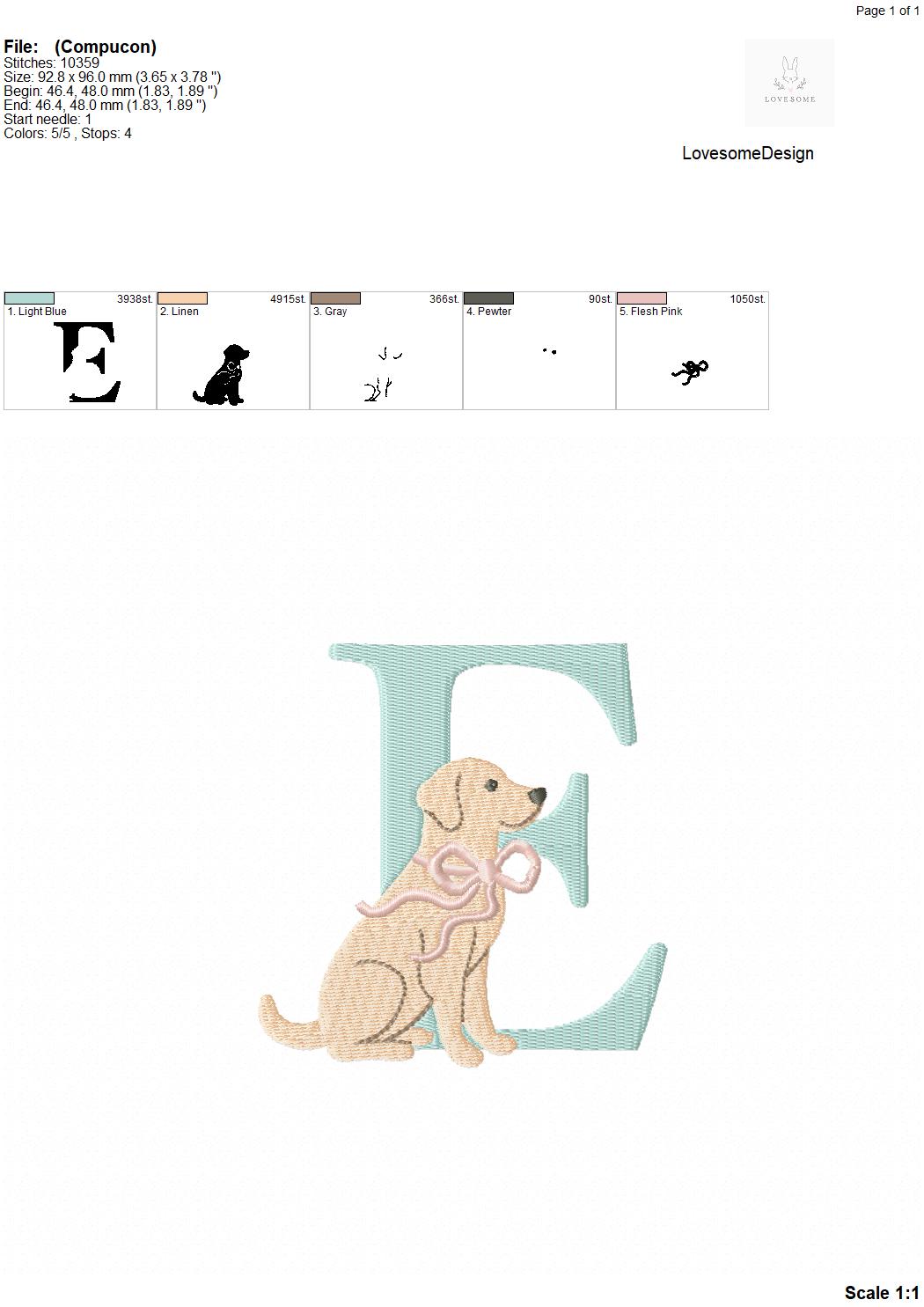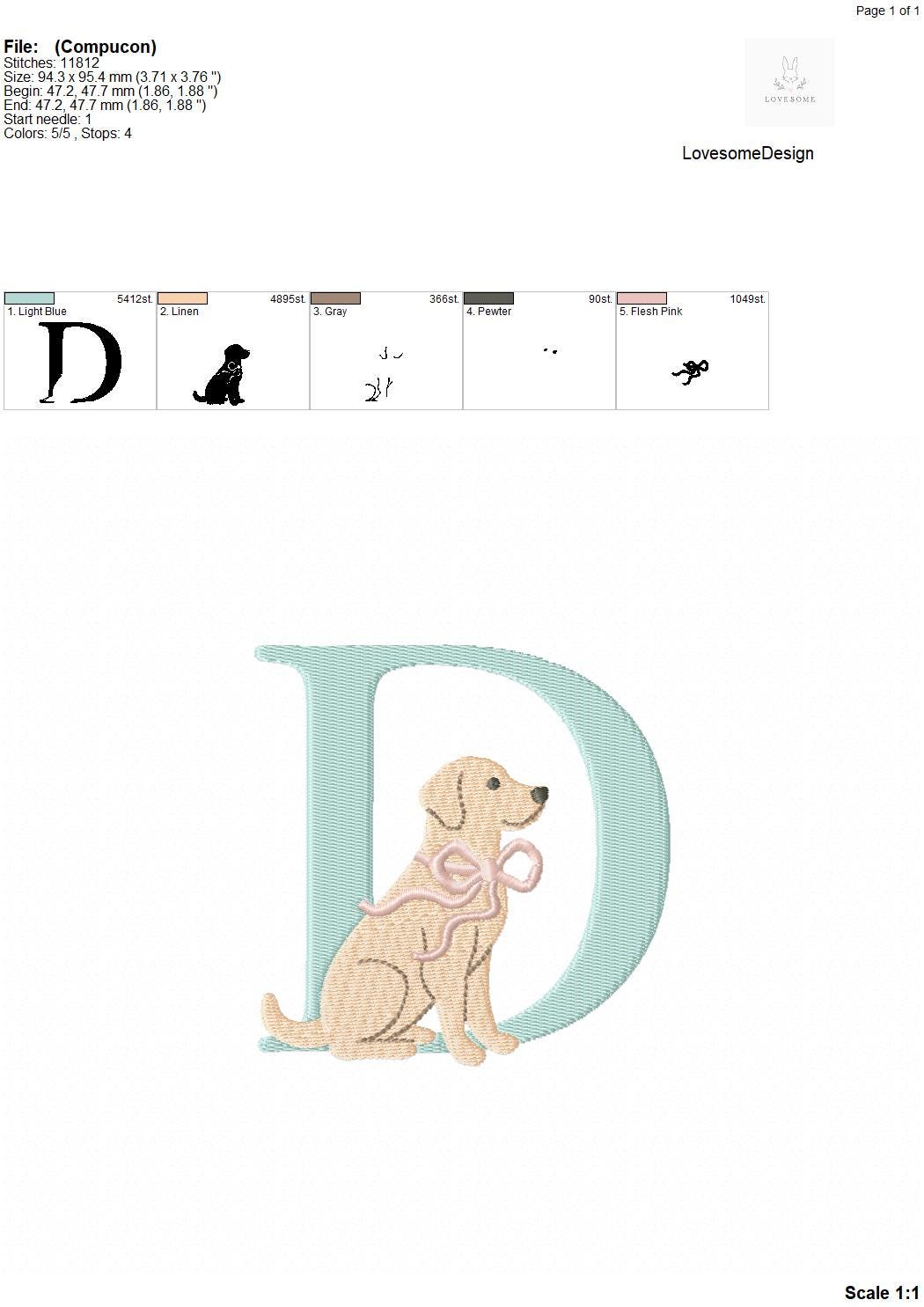 This listing features a machine embroidery font set which includes embroidery files of 26 uppercase monogram letters with cute golden retriever labrador dog design wearing a cute bow in 4inch size. (For the whole set, pls see the listing images.)